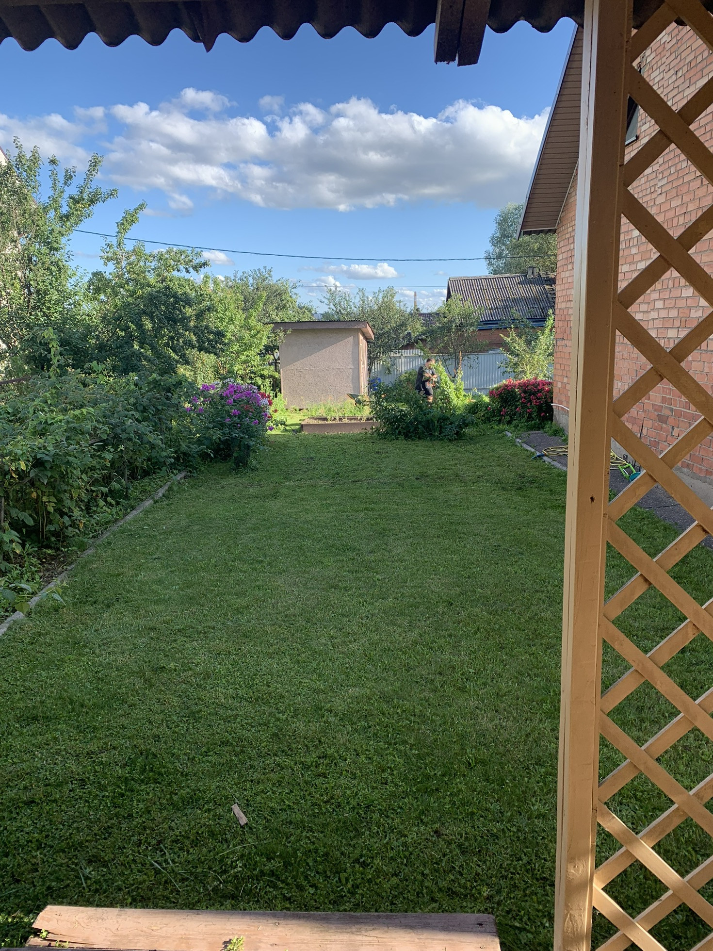 Основная часть участка засеяна газоном сорта лилипут (растет густо и медленно), есть оборудованные грядки из ПВХ, современная теплица из поликарбоната с капельным поливом, летняя вода.