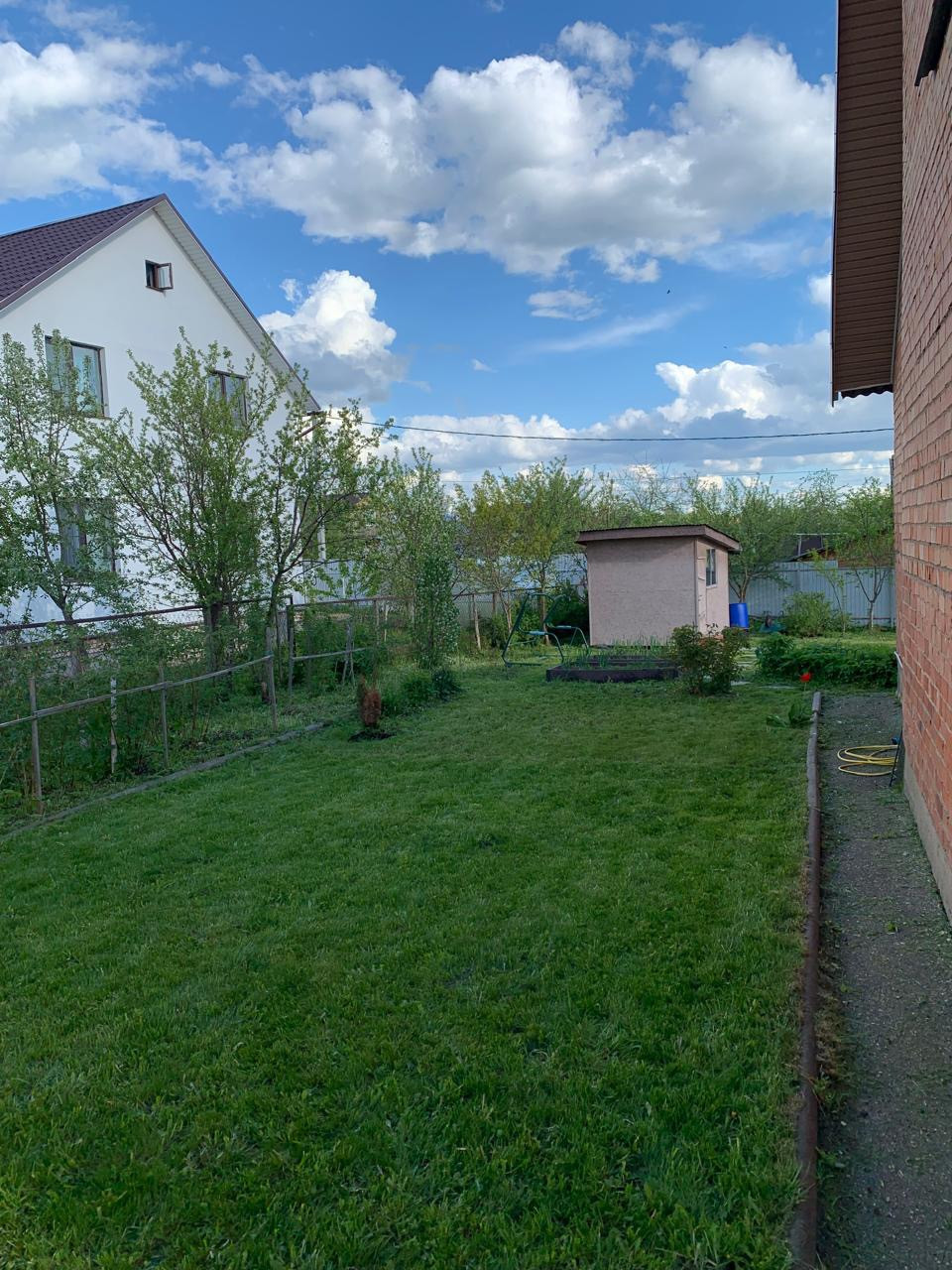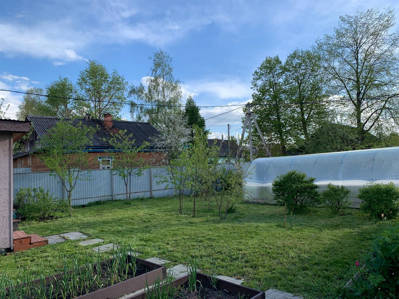 Приусадебный участок, огороженный забором из профнастила, с гаражом и хозблоком для хранения инвентаря и инструментов.