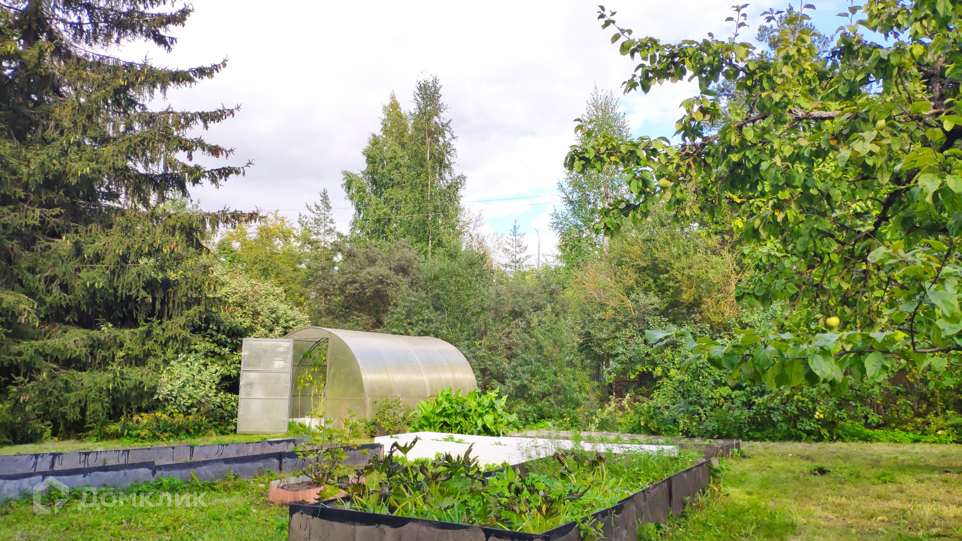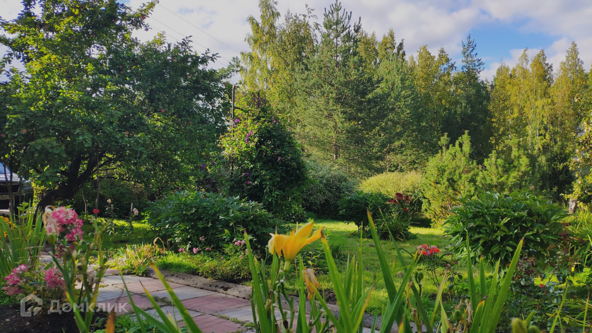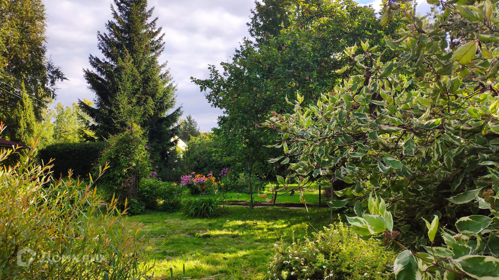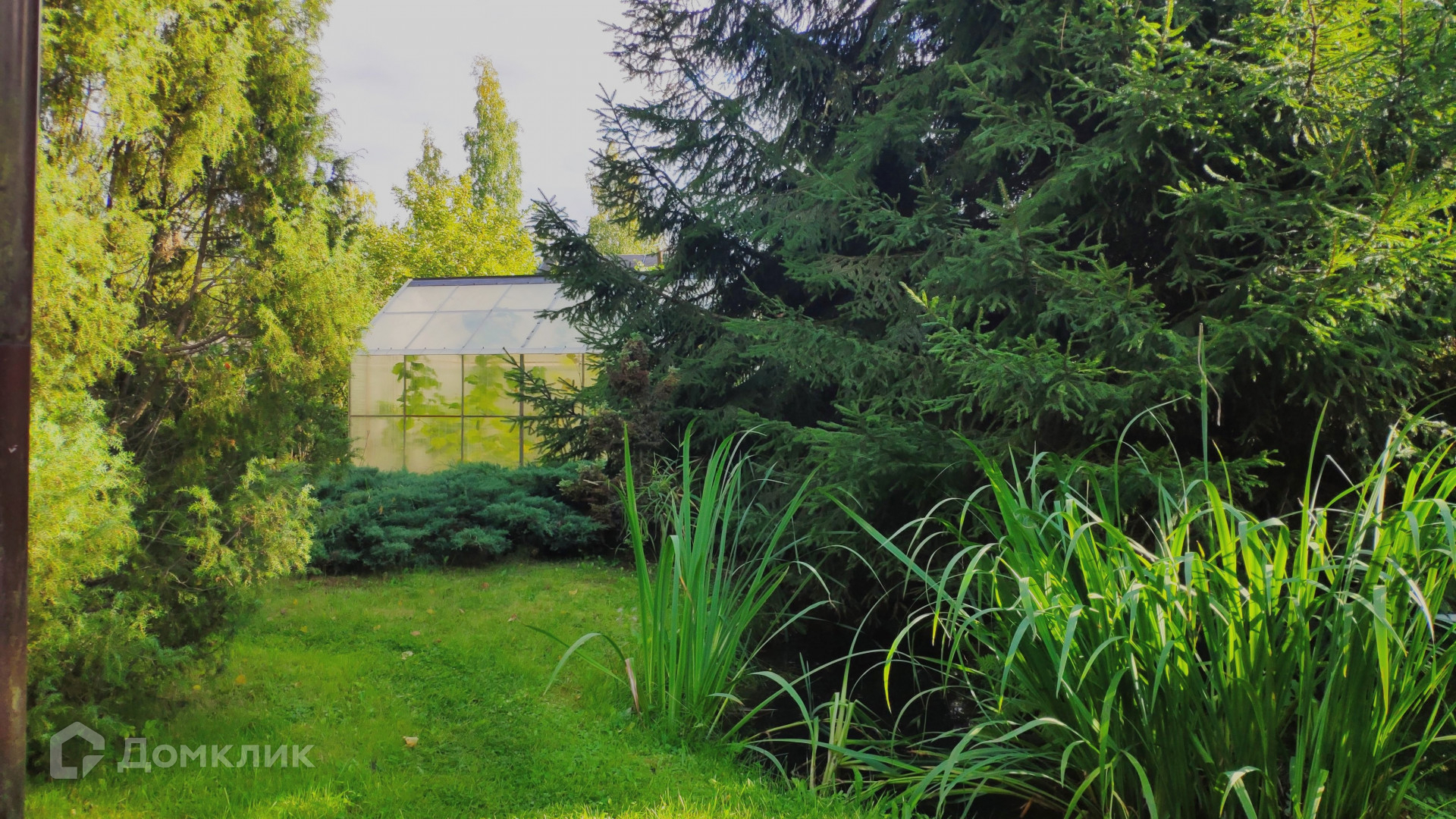 Особая ценность этого домовладения – земельный участок площадью 31,72 с. Он разбит на несколько красиво благоустроенных ландшафтных зон. Создается впечатление, что вы попали в парк. Тут вас ждут тенистые дорожки среди пышных хвойных и лиственных деревьев, два пруда с цветущими по краям ирисами и густыми зарослями можжевельника, фруктово-ягодный сад, богатый на урожай. Для выращивания овощей на участке предусмотрены грядки и 2 теплицы, а парадная зона перед домом украшена цветущими весь сезон клумбами с многолетниками. Вся эта красота с любовью выращена своими руками за многие годы владения. Участок огорожен, парковка для автомобиля вымощена плиткой.