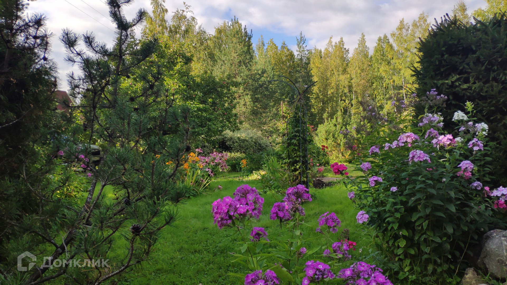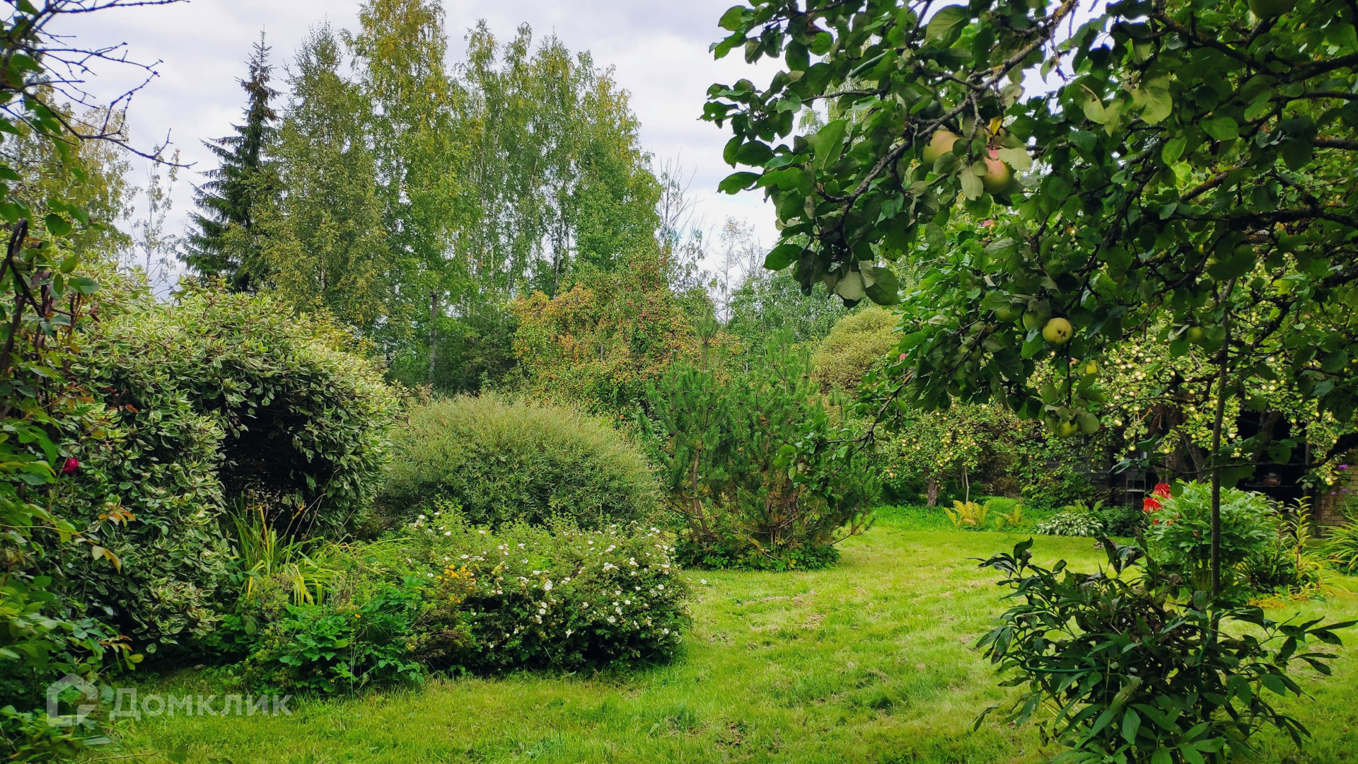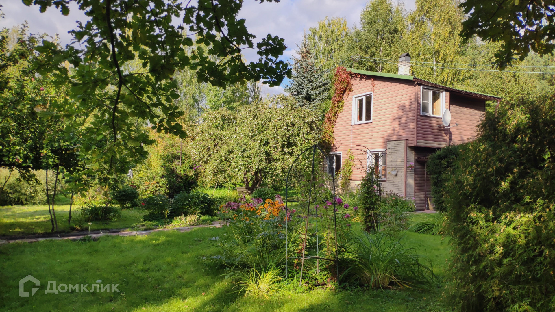 Особая ценность этого домовладения – земельный участок площадью 31,72 с. Он разбит на несколько красиво благоустроенных ландшафтных зон. Создается впечатление, что вы попали в парк. Тут вас ждут тенистые дорожки среди пышных хвойных и лиственных деревьев, два пруда с цветущими по краям ирисами и густыми зарослями можжевельника, фруктово-ягодный сад, богатый на урожай. Для выращивания овощей на участке предусмотрены грядки и 2 теплицы, а парадная зона перед домом украшена цветущими весь сезон клумбами с многолетниками. Вся эта красота с любовью выращена своими руками за многие годы владения. Участок огорожен, парковка для автомобиля вымощена плиткой.