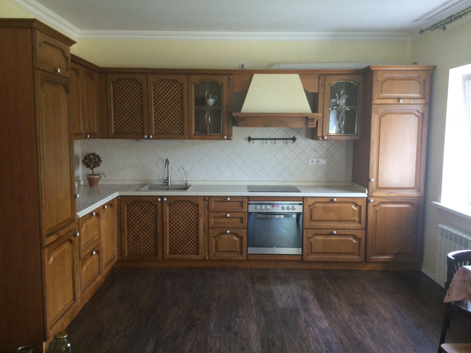 Немецкий газовый котёл. Двери в доме , лестница на второй этаж , что фасады кухни выполнены из массива дерева.Встроеннaя бытовая техника : двухкамерный холодильник Bosh , стеклокерамический варочная панель и электродуховка.