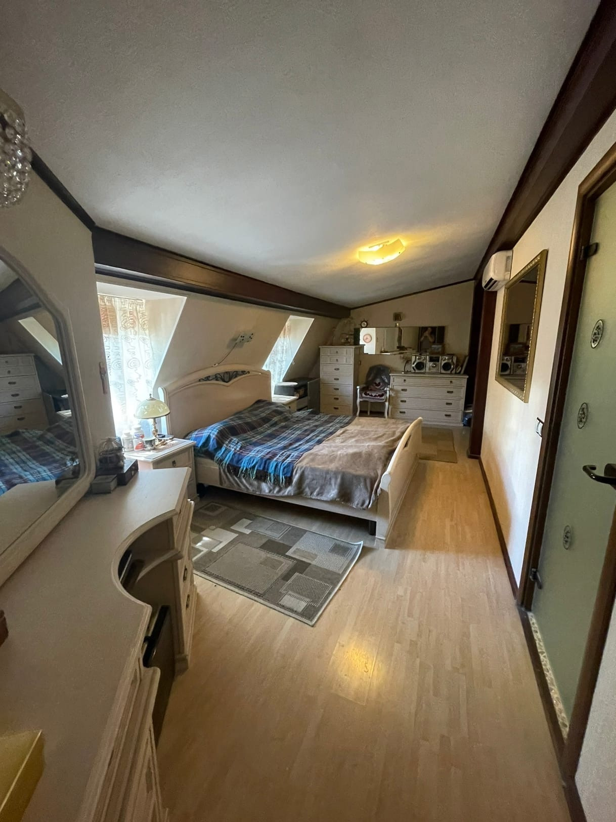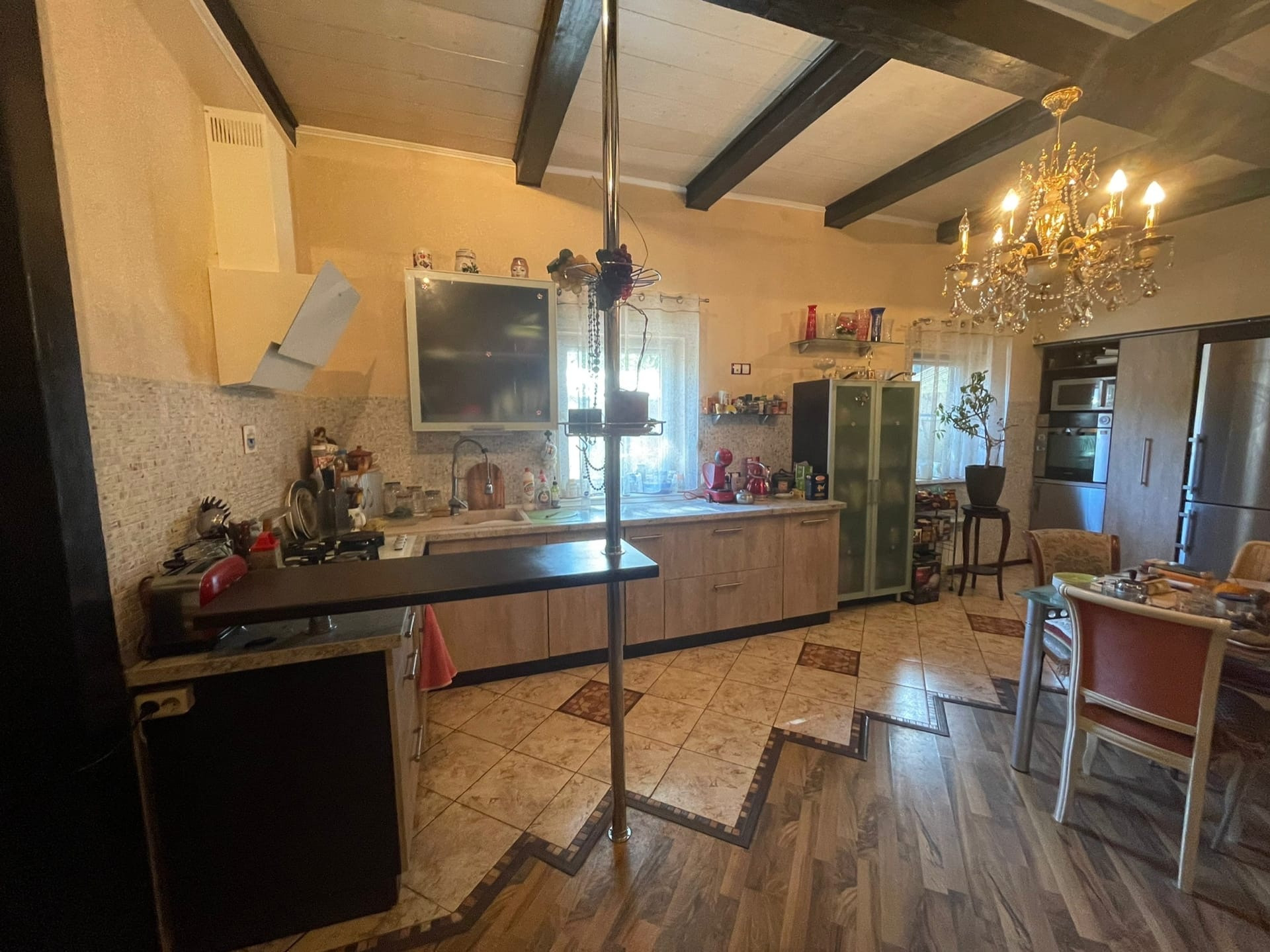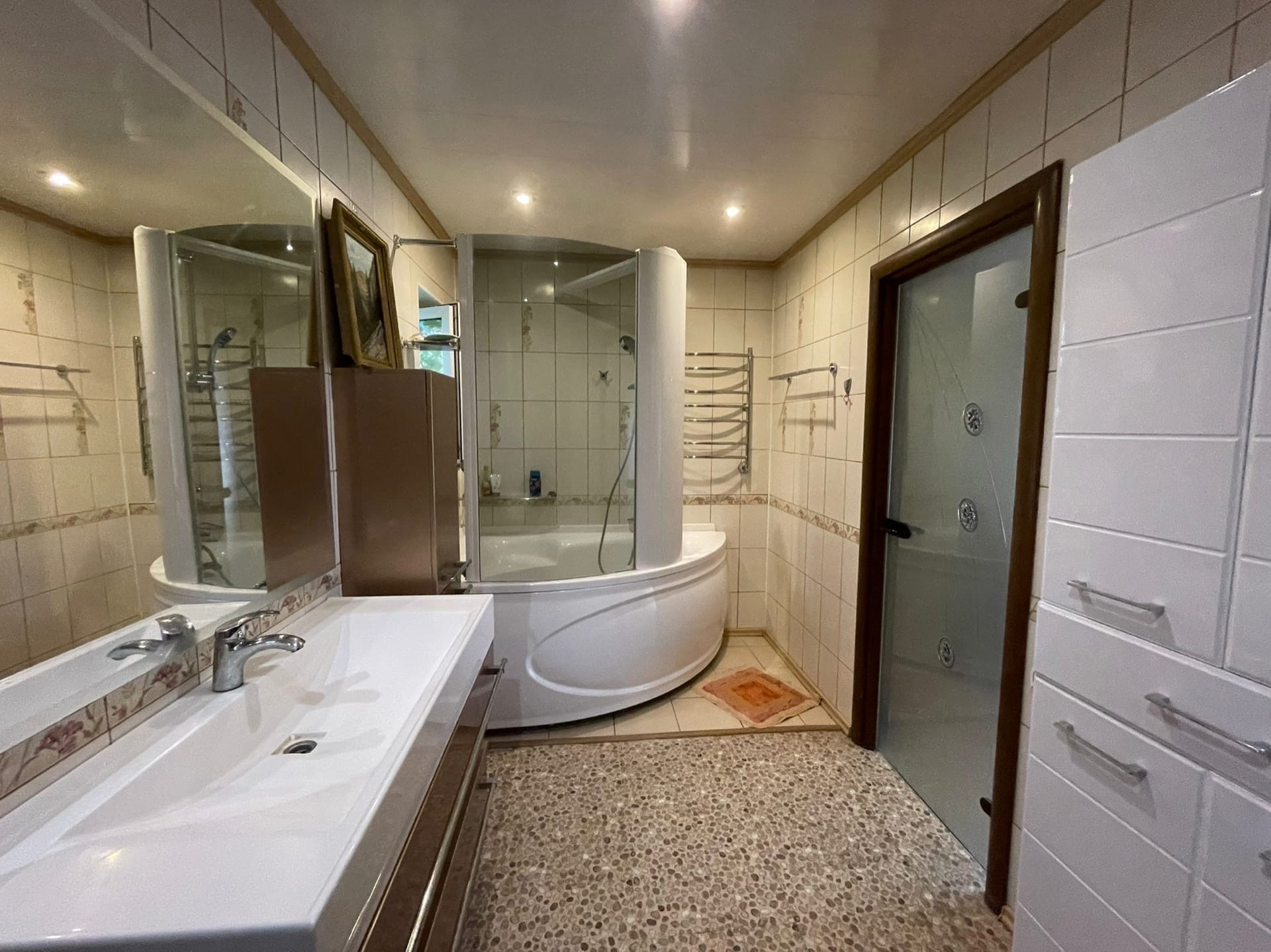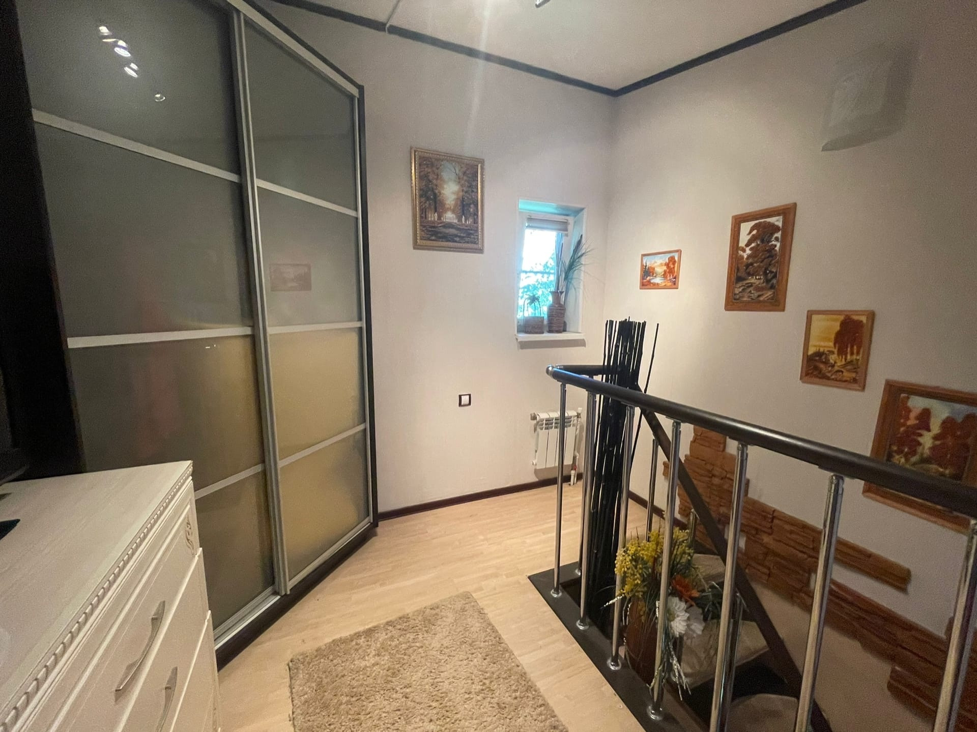 На участке расположен дом (по документам квартира, назначение - жилое) - 102,5 кв.м. ЦЕНТРАЛЬНОЕ ВОДОСНАБЖЕНИЕ, ОТОПЛЕНИЕ И КАНАЛИЗАЦИЯ. Газ баллонный. На первом этаже: большая кухня совмещенная с гостиной 32,1 кв.м. с камином; коридор 10,1 кв.м. с лестницей на второй этаж; совмещенный санузел с душевой кабиной. Высокие потолки. На мансардном этаже 2 комнаты: 9,7 и 20,5 кв.м., соединенный вместительным коридором 8,8, в котором установлен большой угловой шкаф и комод. Большая комната-смарт-спальня с выходом в вместительный гардероб 3,6 кв.м. и санузел 8,9 кв.м. с огромной ванной и ЭЛЕКТРИЧЕСКОЙ САУНОЙ. В доме сделан качественный, продуманный, современный ремонт. На первом этаже установлены ТЕПЛЫЕ ПОЛЫ. Есть 2 кондиционера на первом и втором этаже, что актуально в летнее время года. В ванных комнатах выполнен ремонт кафелем. В доме в ПОДАРОК остается кухня с барной стойкой, шкафы в коридорах на первом и втором этажах, кровать в спальне.
