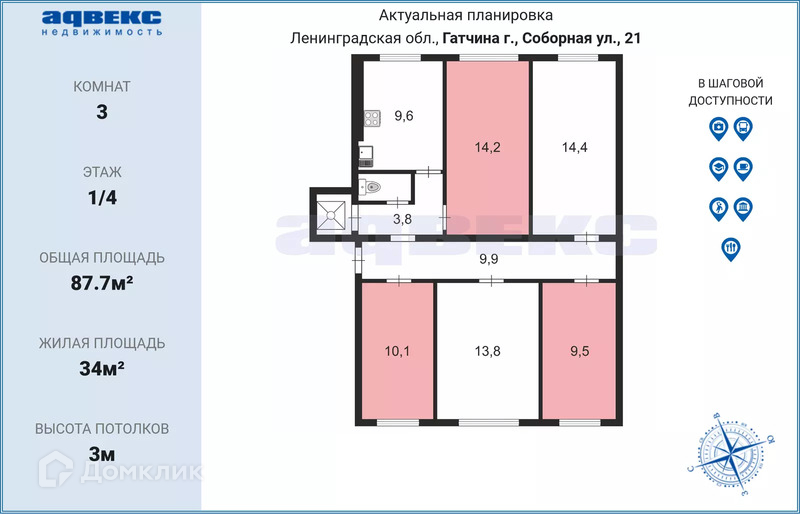 Комната, 87.7 м2, на продажу в Гатчине, Соборная улица, 21