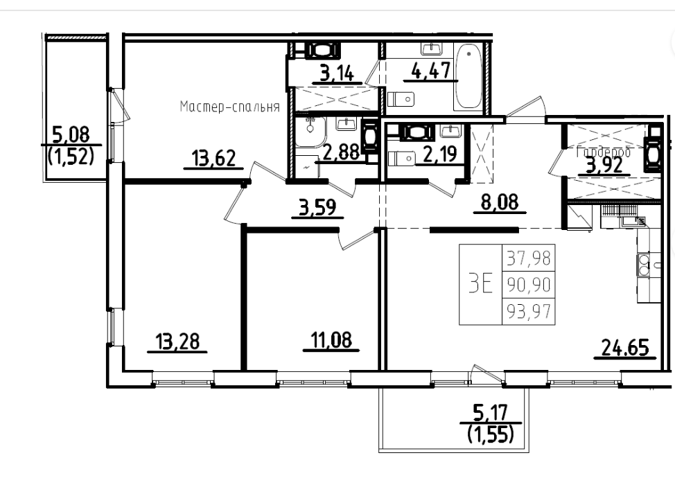 Общая площадь 93.97 м2