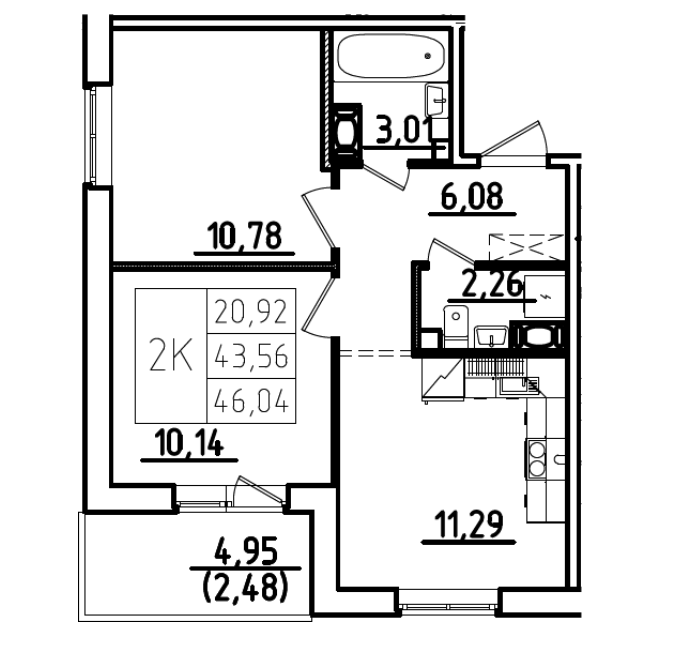 Общая площадь 46.04 м2