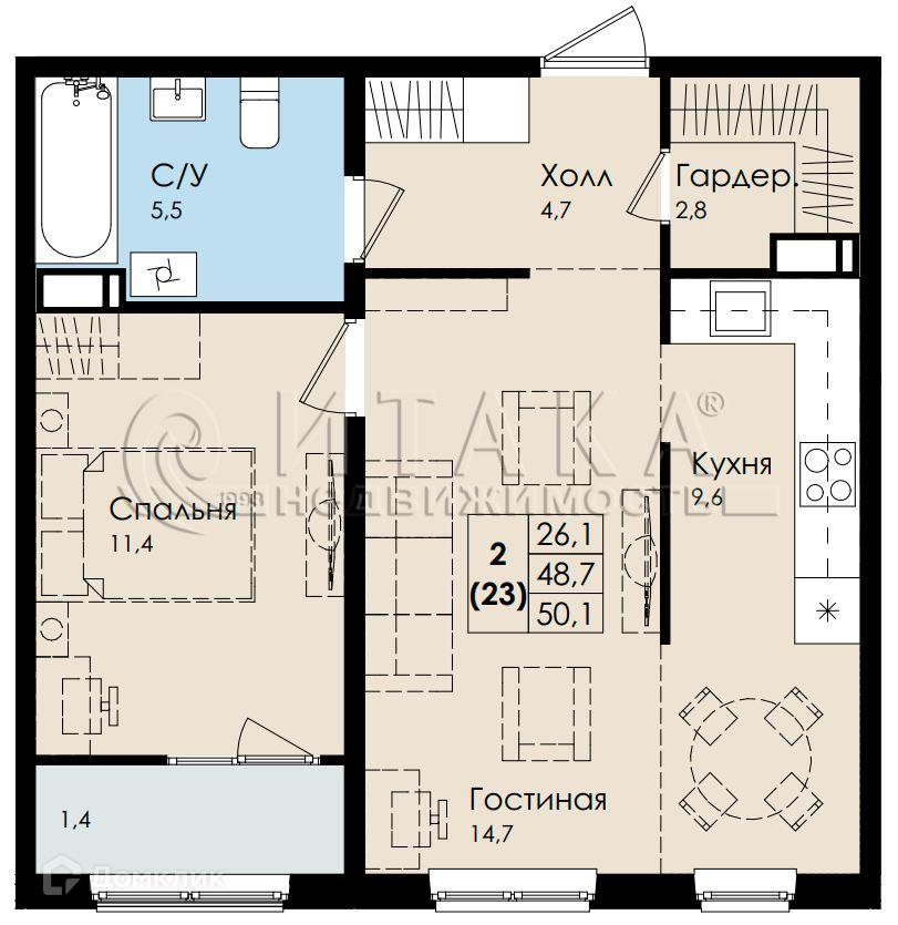 Общая площадь 50.1 м2