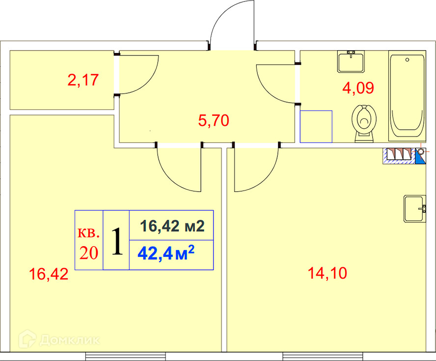Общая площадь 42.4 м2