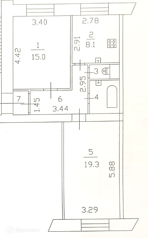 Жилая площадь 34.3 м2