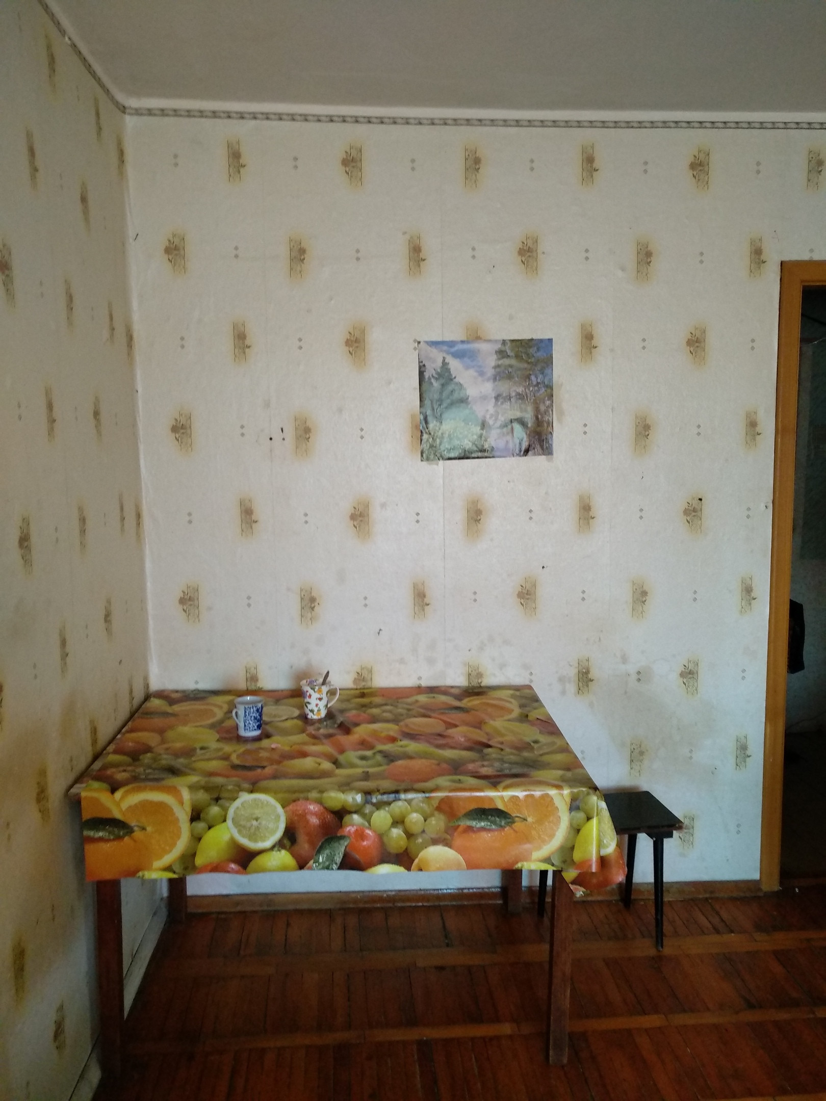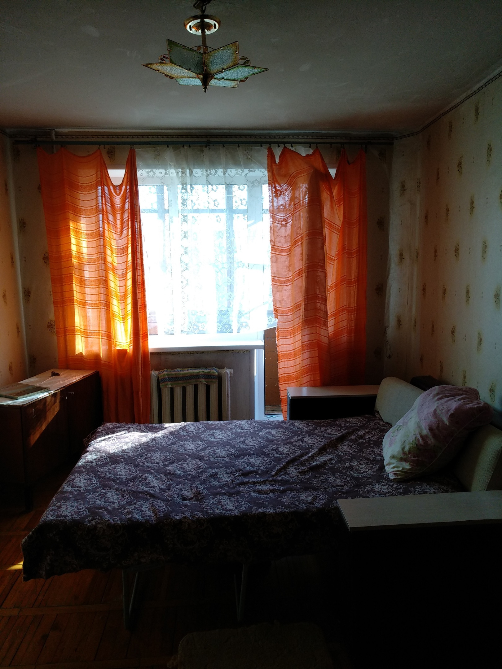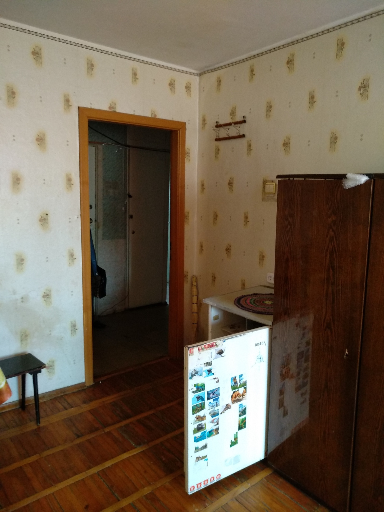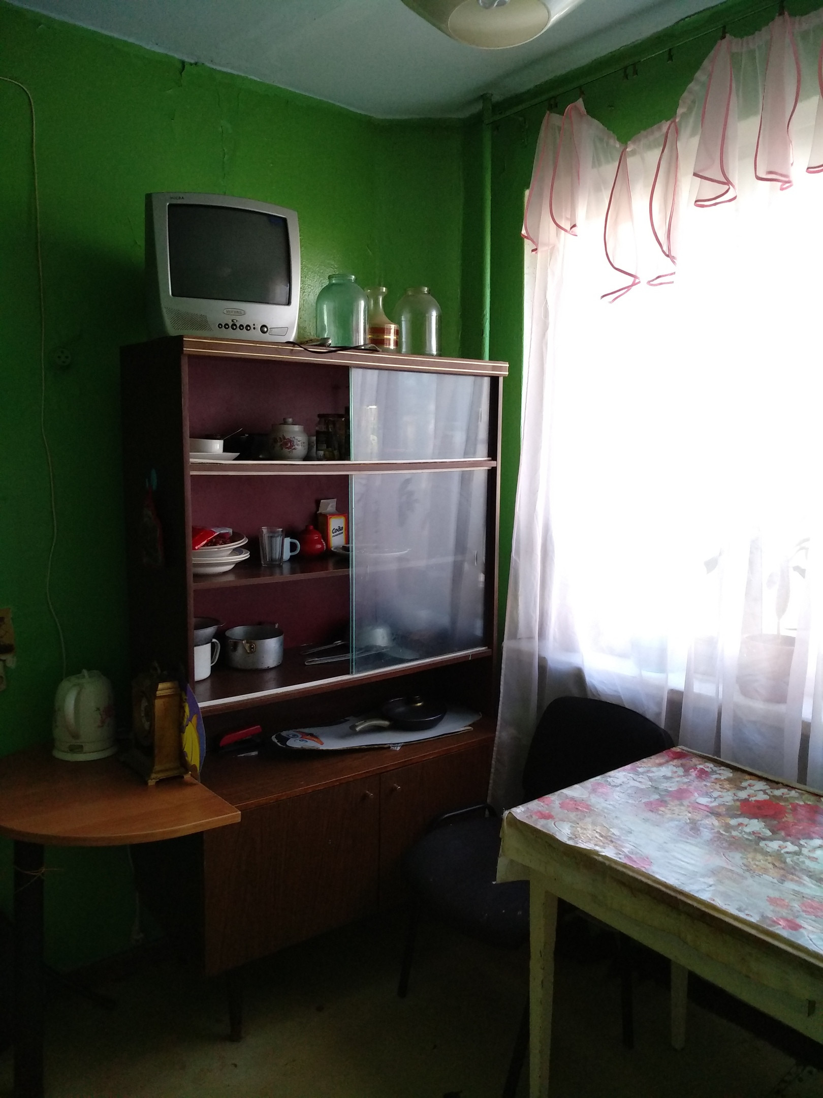 - В комнате есть вся необходимая для проживания мебель:большой диван, стол обеденный, шкаф платяной, тумба, из бытовой техники - холодильник, на кухне, стол, сервант;