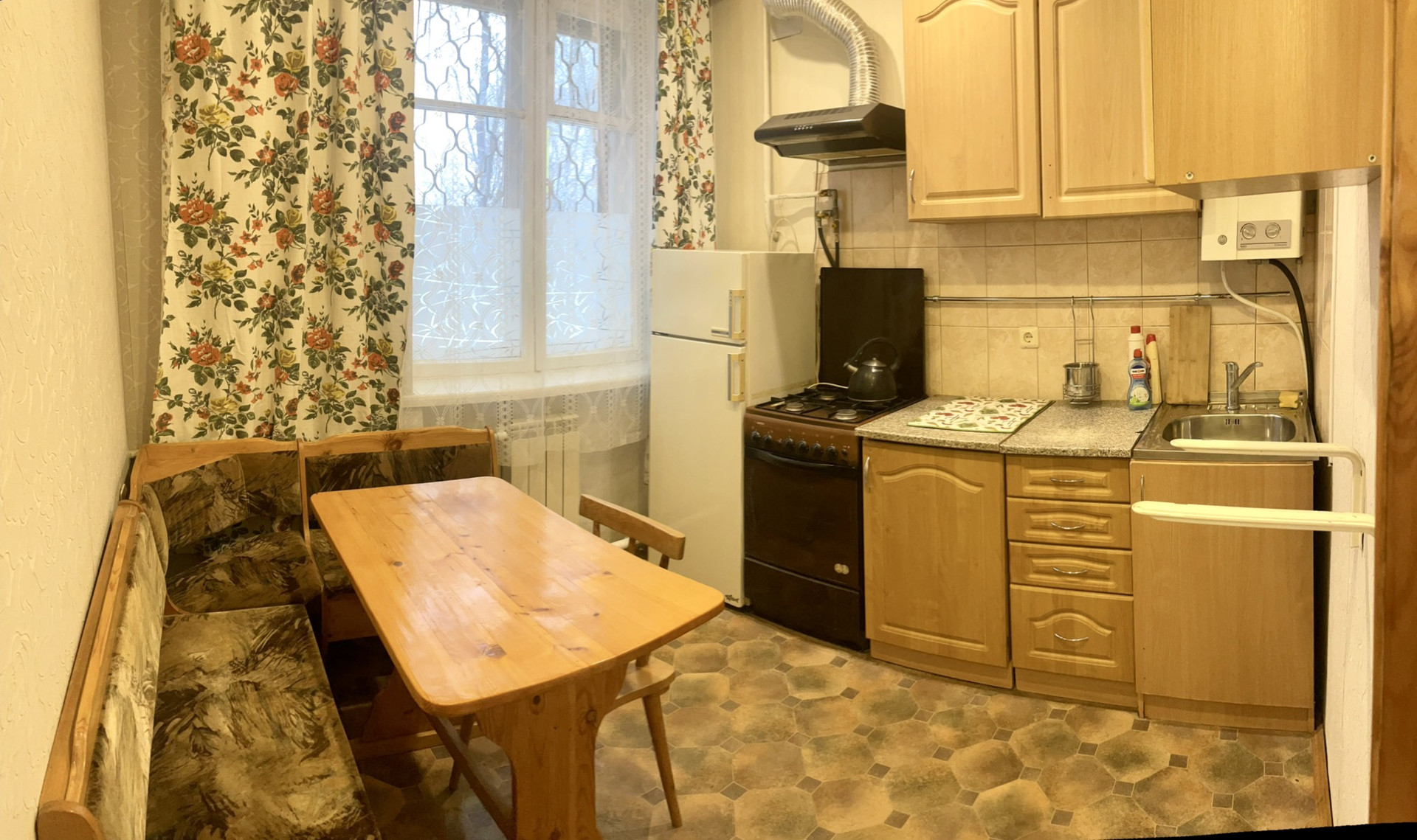 Мебель: стенка мебельная, кресло-раздвижное, диван ( имеются небольшие потертости) раздвижной 1 шт. 2 сп., тахта 1сп. 1шт., большой встроенный шкаф. кухонная мебель газ плита с духовкой, стол обеденный, уголок, холодильник, газ. колонка автомат, стир. Маш. Автомат готовы приобрести в счёт арендной платы.