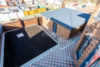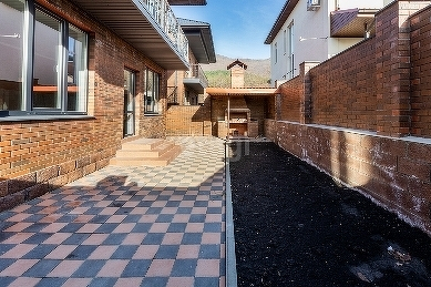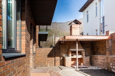 - просторная кухня-гостиная, с дополнительным выходом во дворик, где размещена место отдыха, палисадник и мангальная зона.