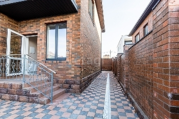 Участок огорожен забором из облицовочного кирпича, в едином стиле с домом и гаражом.