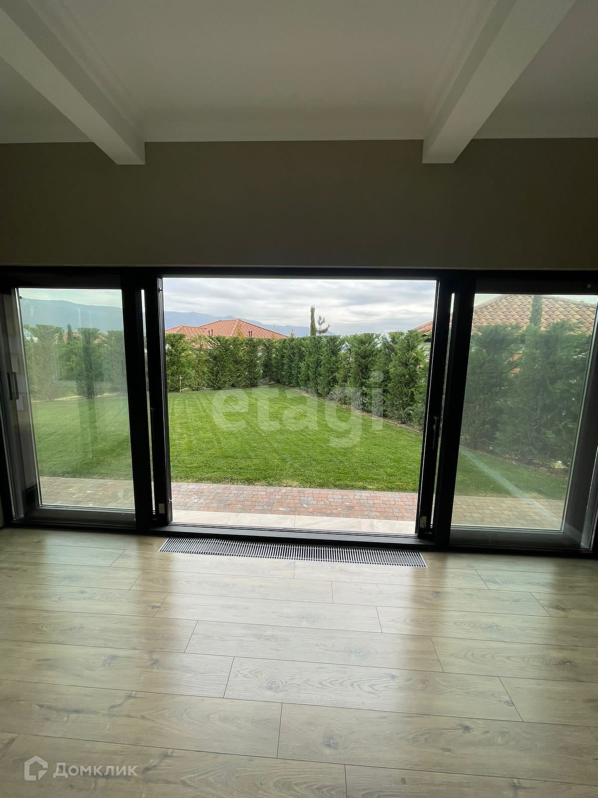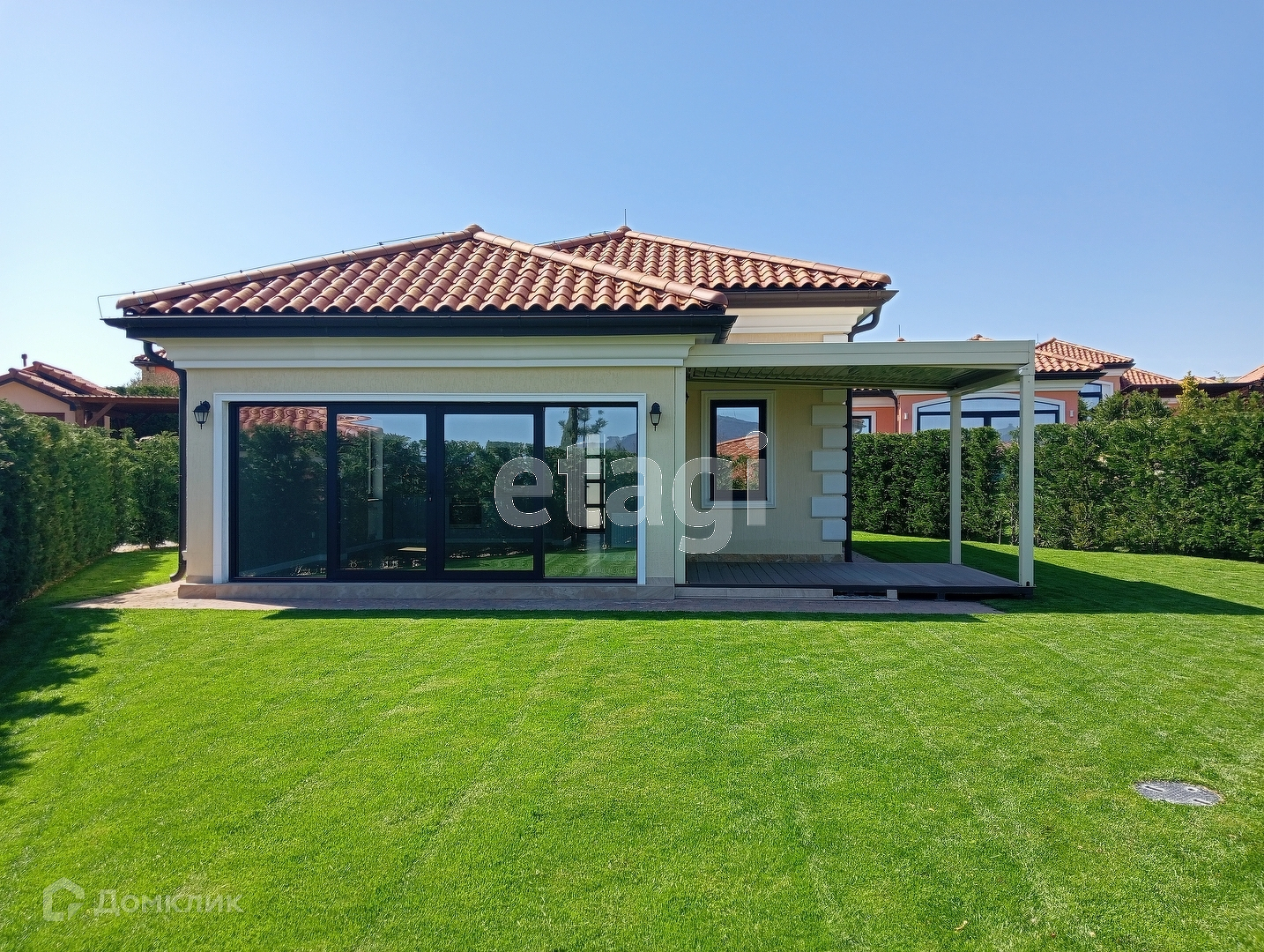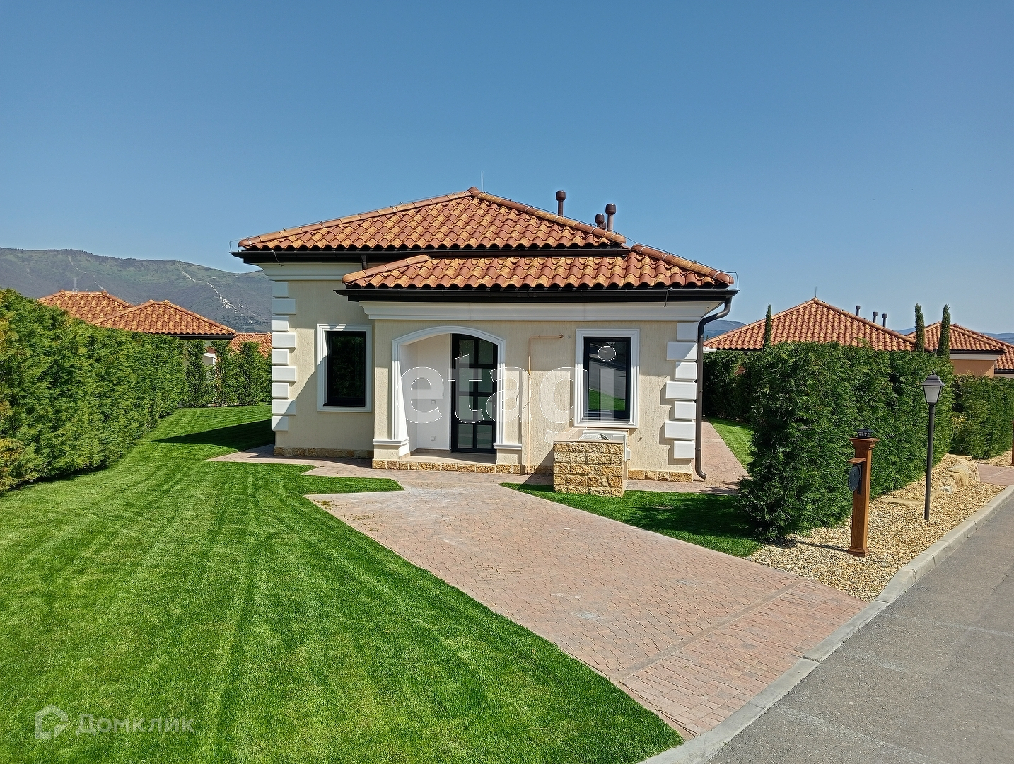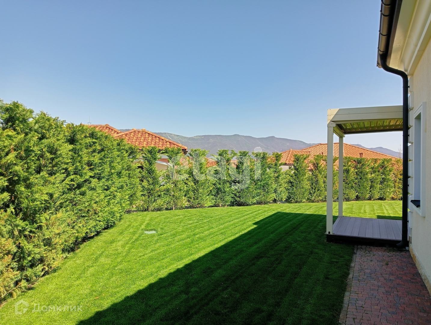 На территории земельного участка шикарное озеленение: вилла огорожена живой изгородью из туи и итальянского кипариса, газон с автополивом, за которым следит управляющая компания.