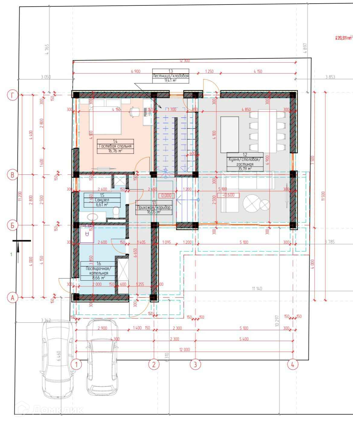 1 этаж: кухня-гостиная, спальня, санузел, прачечная,котельная, холл.