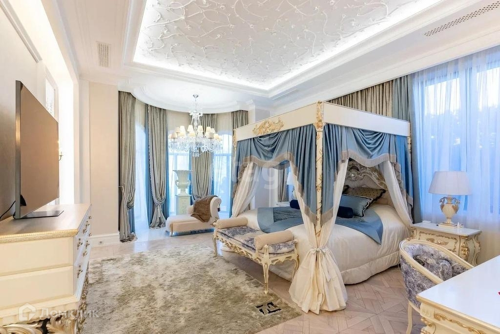 Текстиль ( шторы , балдахин , кроватное покрытие ) выполнено из Английского шелка . Лепнина из гипса на потолке ручная работа , выполнена из французского гипса . Разетки из Гипса привезены из Франции . В Ванной комнате синяя люстра ( Мурано ) .