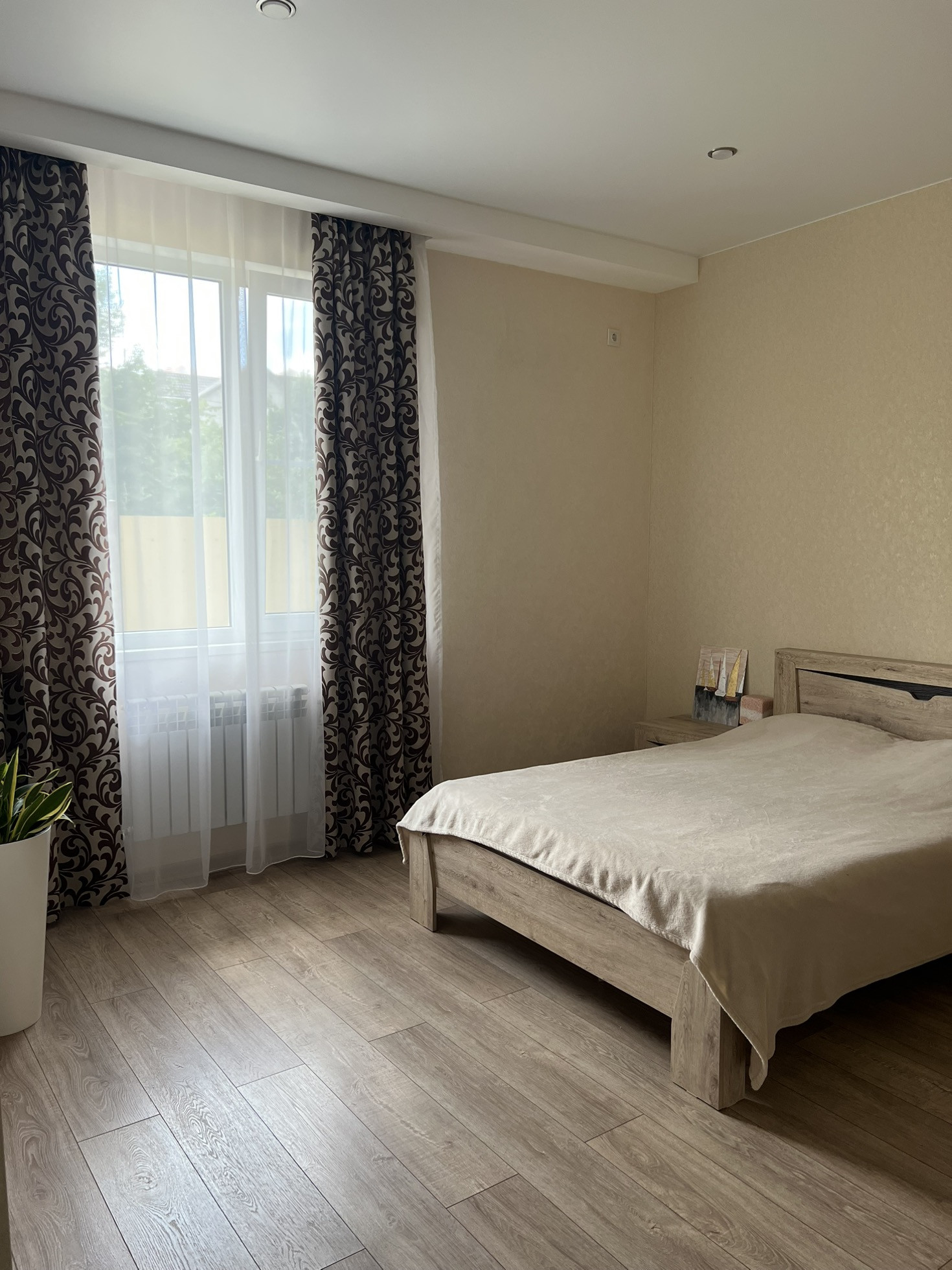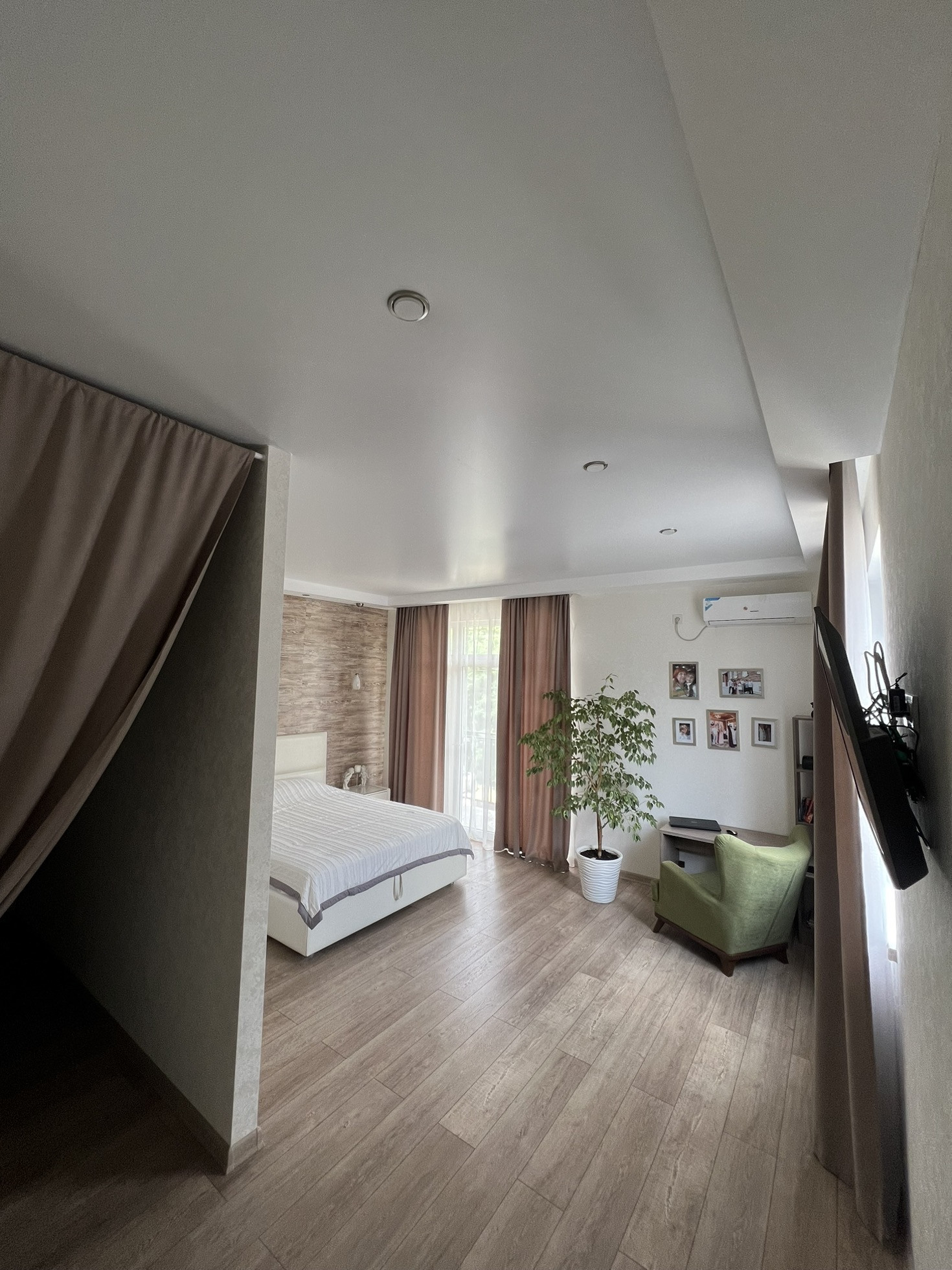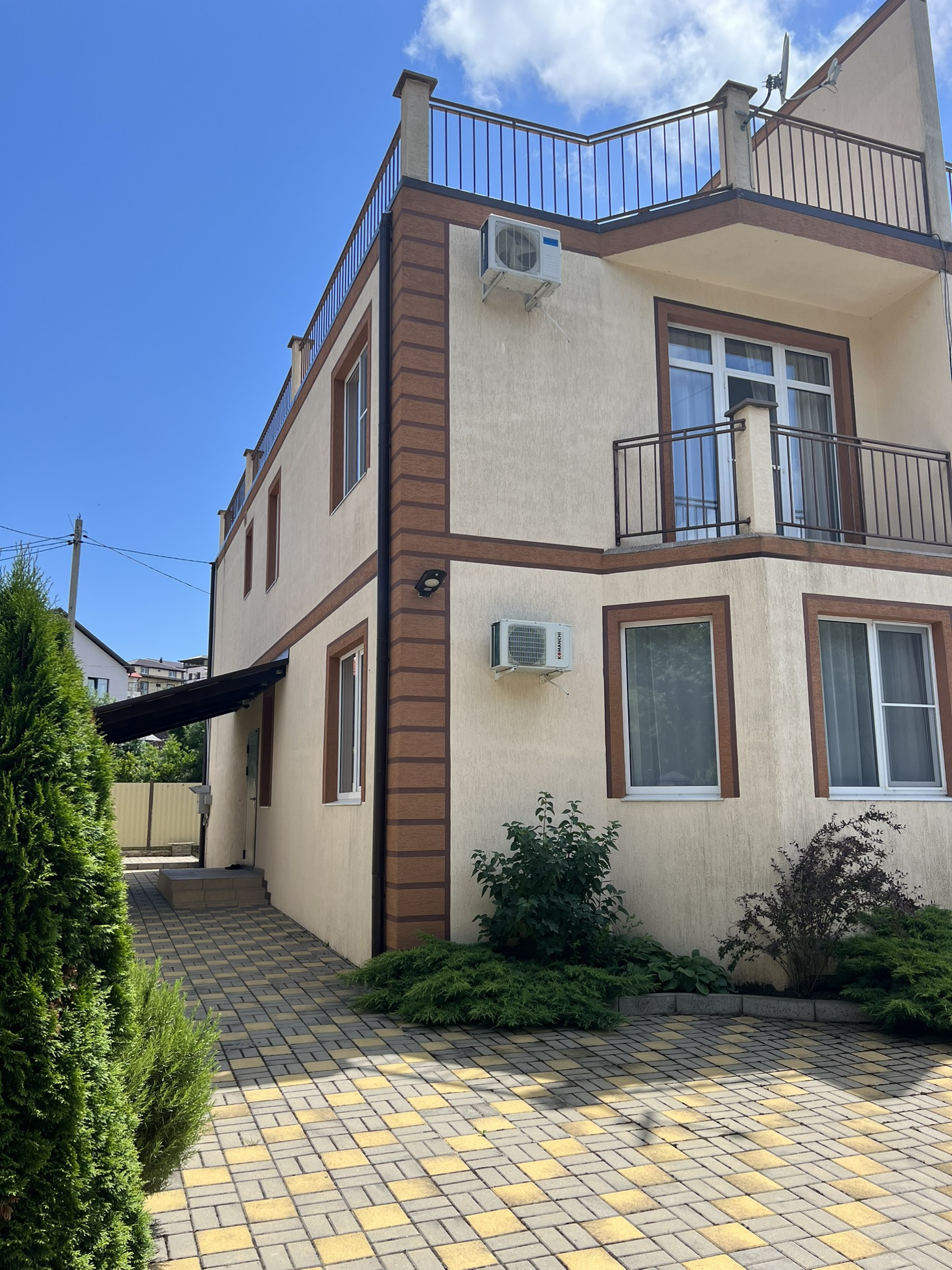 В доме: кухня-гостиная, три спальни, два санузла. В каждой спальне гардеробная. До с эксплуатируемой террасой.