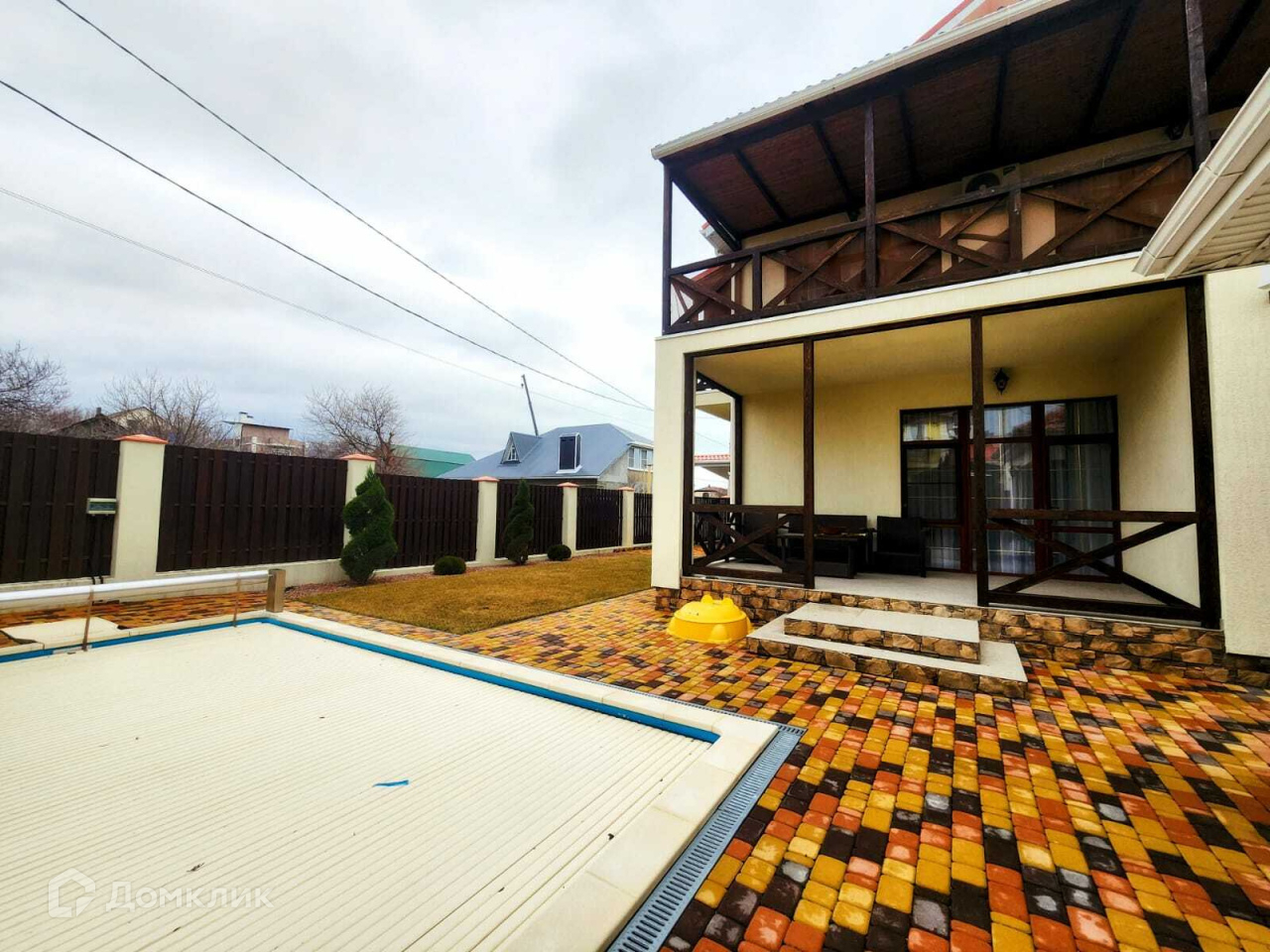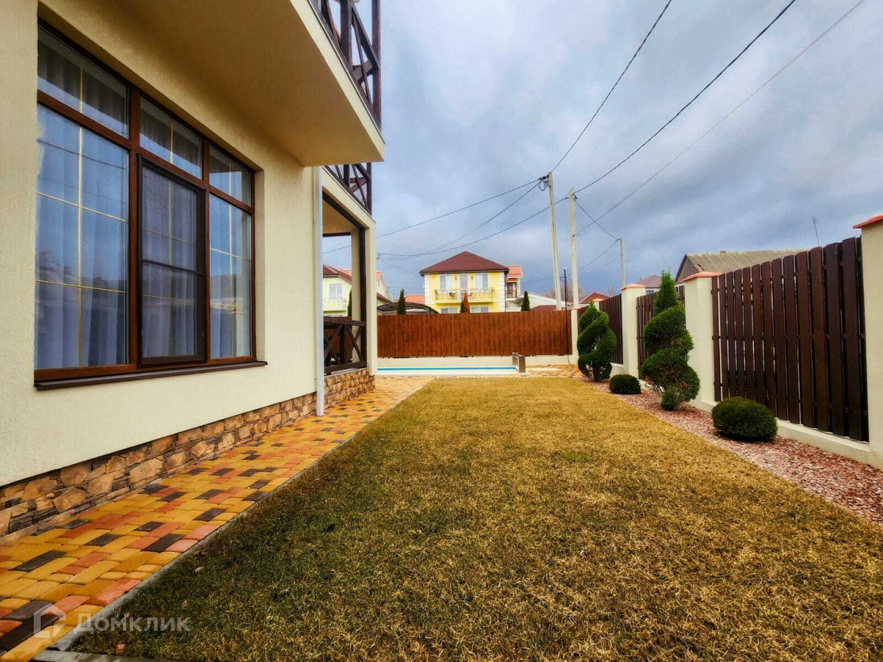 Территория вокруг дома благоустроена, замощена плиткой, устроен газон с декоративными насаждениями и плодовыми деревьями, предусмотрена система полива. Есть бассейн размером 3x6 метров с автоматическим пологом. Также на территории расположен небольшой домик с мангальной зоной, гараж с автоматическими воротами и крытая парковка.