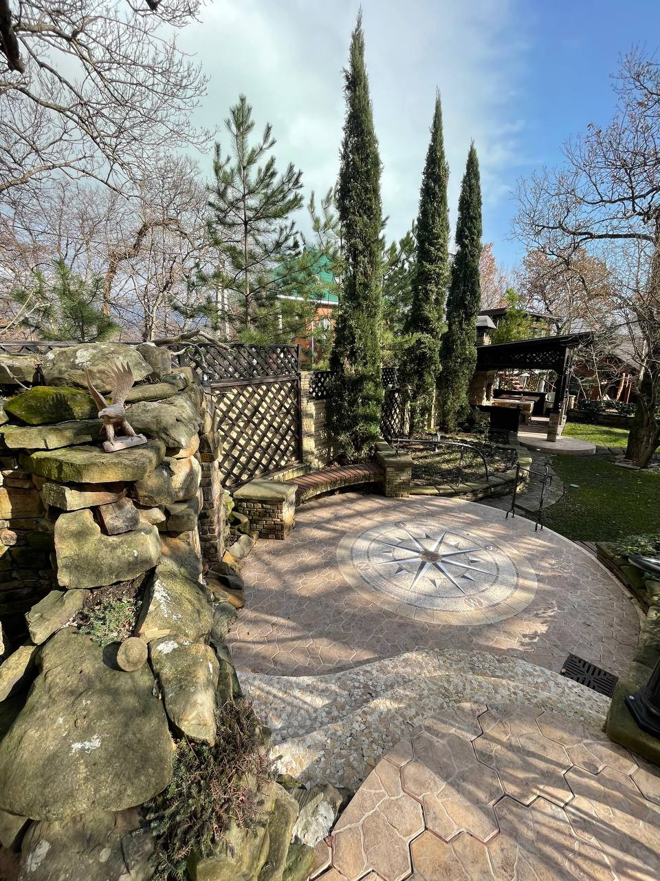 Что касается участка, то весной в момент цветения, он преображается до неузнаваемости, он утопает в цветах и зелени. А в зимний период участок украшен великолепной художественной ковкой инкрустированной витражным разноцветным стеклом, это не просто ковка, это произведение искусства, это растения застывшие в металле. Так же на участке есть рукотворный грот с лавочкой, это авторская работа художника-каменщика, грот является одним из акцентов участка а площадку перед гротом украшает роза ветров выполненная итальянской мозаикой. Благодаря грамотно спланированной системе освещения участка с управлением Lutron, ночью двор наполняется мягким равномерным светом, а по желанию и музыкой, так как на участке расположены специальные уличные колонки в виде больших булыжников.