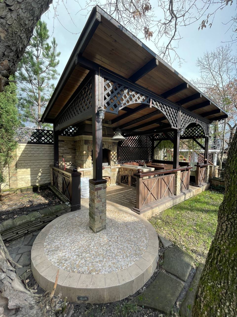 Беседка с барбекю уникальна в своем роде, выполнена по эскизам архитектора и художников, каждый камень в кладке ручной работы, колпак дымохода выполнен из чистой меди, освещение и управление освещением (открытая ретро проводка) фабрики AldoBernardi, прочие приятные глазу элементы такие как створки решеток барбекю в виде паутины с паучком, выполнены кузнецами-художниками по эксклюзивным эскизам.