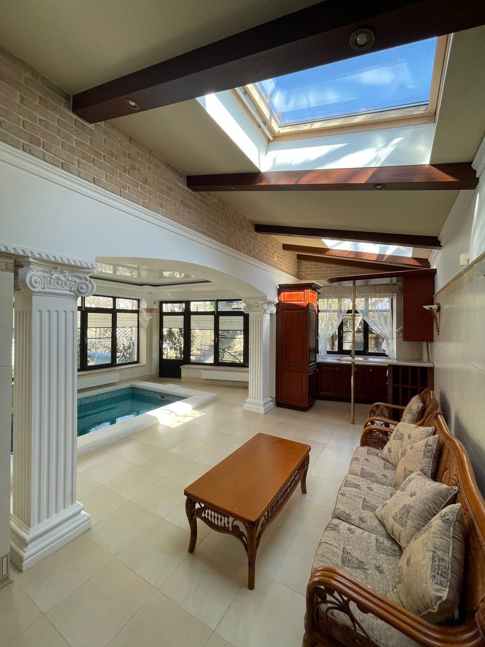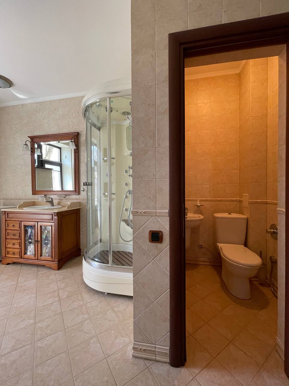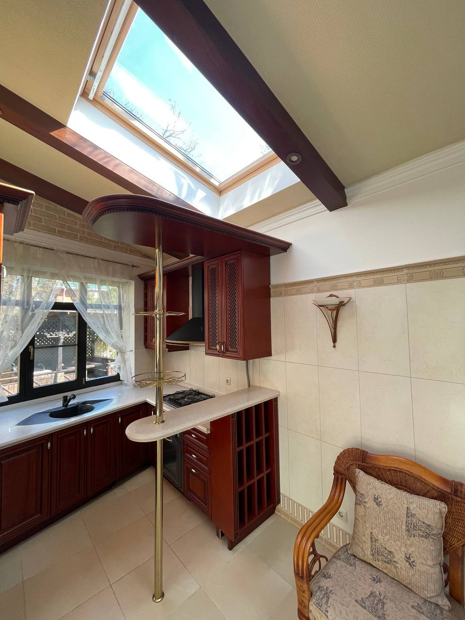 Основной дом заслуживает особого внимания. Стены толщиной 500 мм выполнены из красного кирпича. Ограждения балконов и парапетов из нержавеющей стали. Большие окна с низкими подоконниками наполняют дом оптимально уютным светом. Оконные рамы дубовые с двойным стеклопакетом, механизмы открывания и проветривания работают как часы. Внутренний интерьер выполнен по дизайн-проекту и с авторским сопровождением дизайнера в сдержанном классическом стиле. Отделка интерьера премиум качества, все в идеальном состоянии, ни трещины ни потертости, все крепко сидит на своих местах. Вся отделка интерьера выполнена из материалов ведущих европейских брендов, без исключений. Тут нет даже шурупа Китая, Турции, Индии. Вас порадует шикарный пол из итальянского паркета который находится в отличном состоянии и прослужит десятки лет так как это не паркетная и не инженерная доска, это15 мм. массив ценной породы дерева уложенного квалифицированным мастером. Стены отделаны премиальными итальянскими красками, оригинальной венецианской штукатуркой и натуральными обоями из шелка. Уровень качества материалов отделки стен и потолка говорит сам за себя, нет потертостей, не следов выгораний и прочих следов времени.В интерьере много эксклюзивных художественных решений, ручная роспись основной спальни, художественный потолочный витраж Тиффани в кабинете, балясины лестницы. Кстати при осмотре дома обязательно обратите внимание на качество исполнения и состояние лестницы, на ней нет следов эксплуатации, этот важный элемент дома будет служить десятки лет. Сантехника в доме фабрики Devon-Devon, Jacuzzi. Авторитет этих фабрик не требует комментариев. Отдельное внимание хочется уделить меблировке дома, это не просто итальянская мебель ведущих итальянских и испанских фабрик таких как AngeloCappellini,Сantori,Scavolini, эта люксовая мебель-будущий антиквариат, это инвестиции. Тоже касается штор и покрывал, это не ткани с местного салона штор, это элитный Итальянский текстиль, уникальные ткани от 500 евро за кв.м. Бережное отношение хозяев дома к предметам интерьера, позволило сохранить всю меблировку и ткани в идеальном состоянии.Если у вас есть дети, то вас порадует третий этаж дома, он полностью отведен под просторную детскую (спальная, рабочая и игровая зона, с отдельным санузлом), там все так же в прекрасном состоянии.