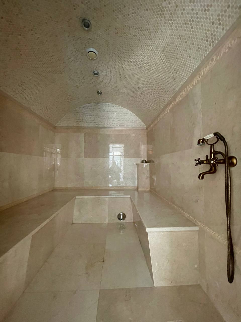 Spa-комплексплощадью 70 кв.м., оснащен бассейном с системой противотока, хамамом, отделанным итальянским мрамором и звездным небом, кухней-гостиной и небольшой спальней. Крыша Spa-комплекса, на которую ведет изящная винтовая лестница с гранитными ступенями, эксплуатируемая с пергольным навесом, оборудована под солярий и проведение летних торжественных мероприятий.