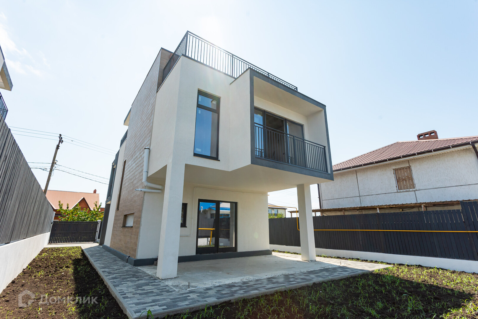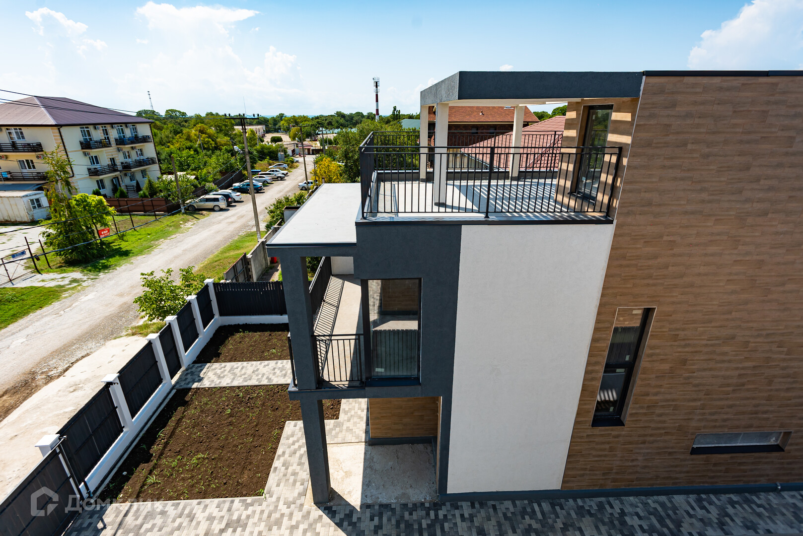 У ворот есть парковочное место для автомобиля. Предусмотрены участки для озеленения. За домом есть место для установки небольшого бассейна.
