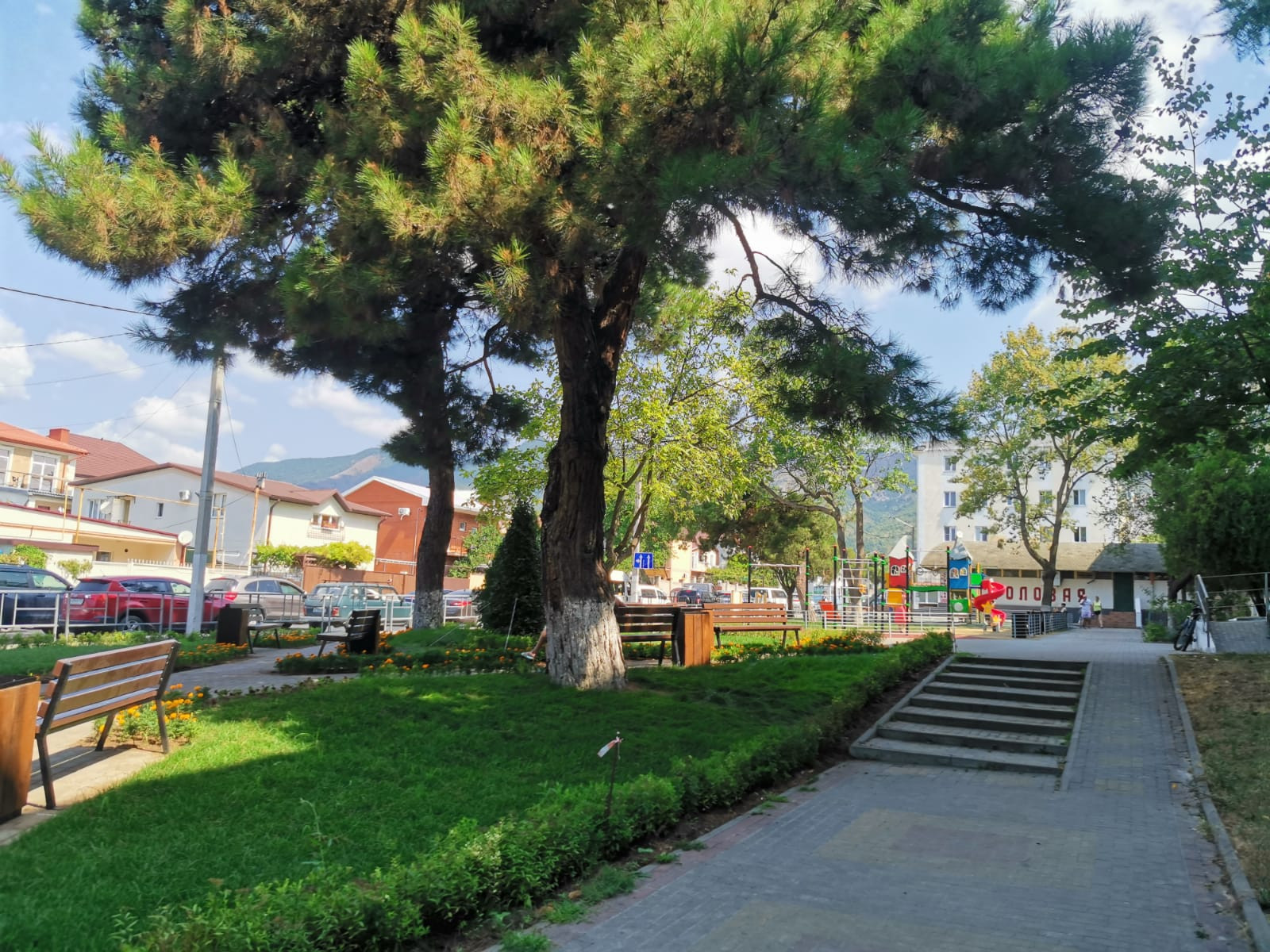 На придомовой территории сделана детская площадка, парковая зона с соснами.