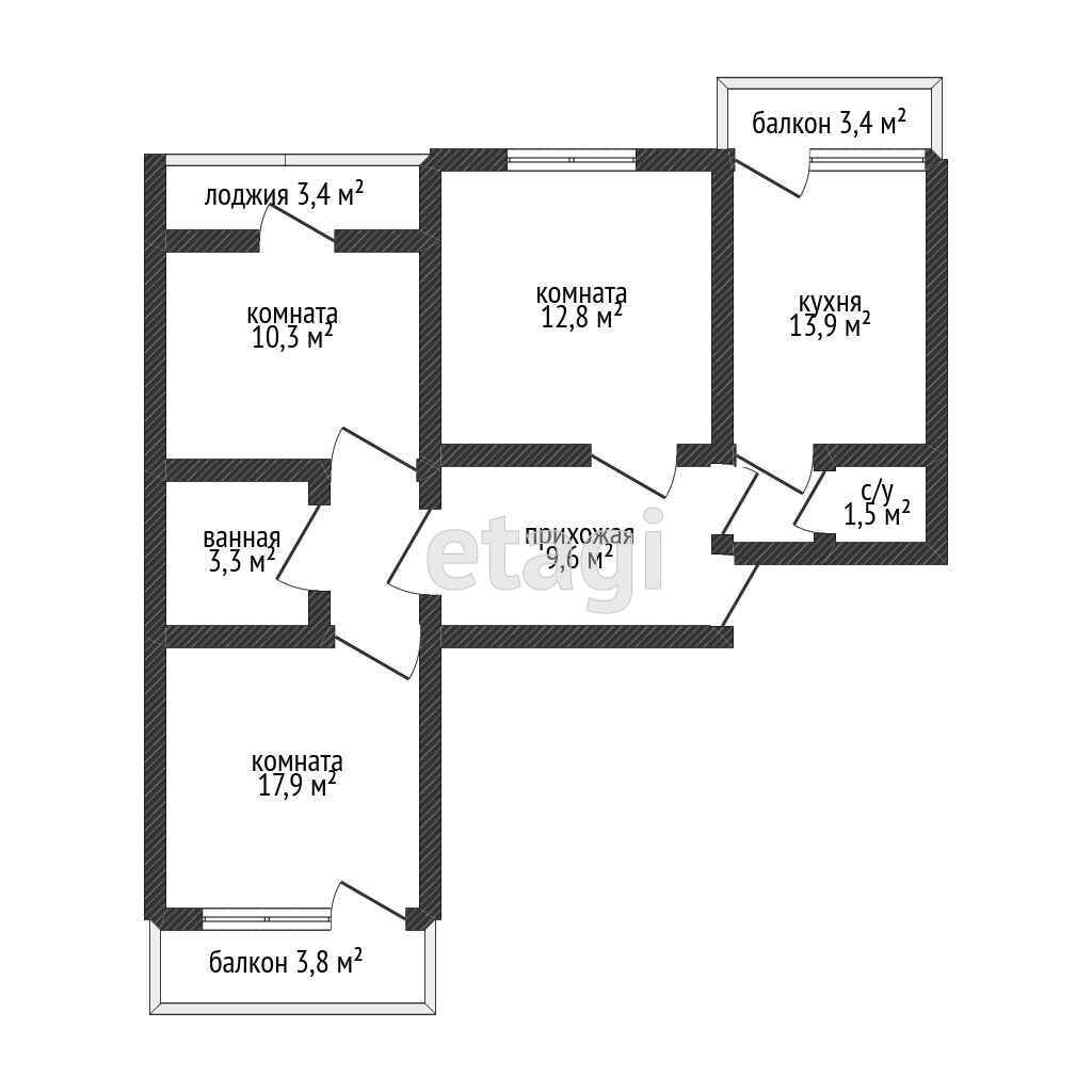 В квартире три раздельные комнаты, площадью 12,8 ,10,3 и 17,9 квадратных метров. Площадь кухни 13,9 квадратных метров. В квартире имеются три балкона, расположенные на разные стороны.