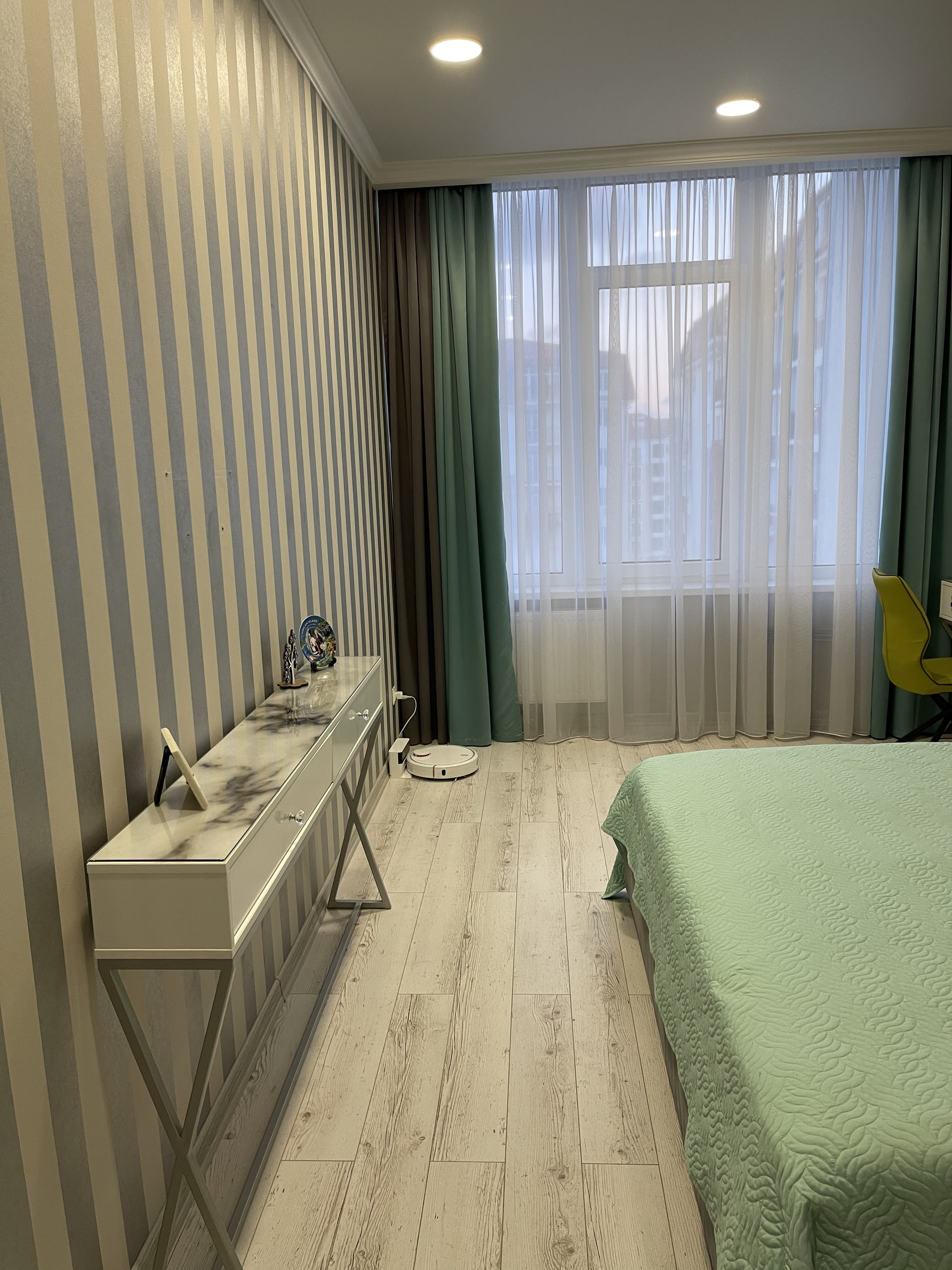 Кровать фирма Ascona, дополнительное спальное место удобное кресло-кровать. Панорамные окна фирма Rehau ( двойной стеклопакет). Тёплый пол.