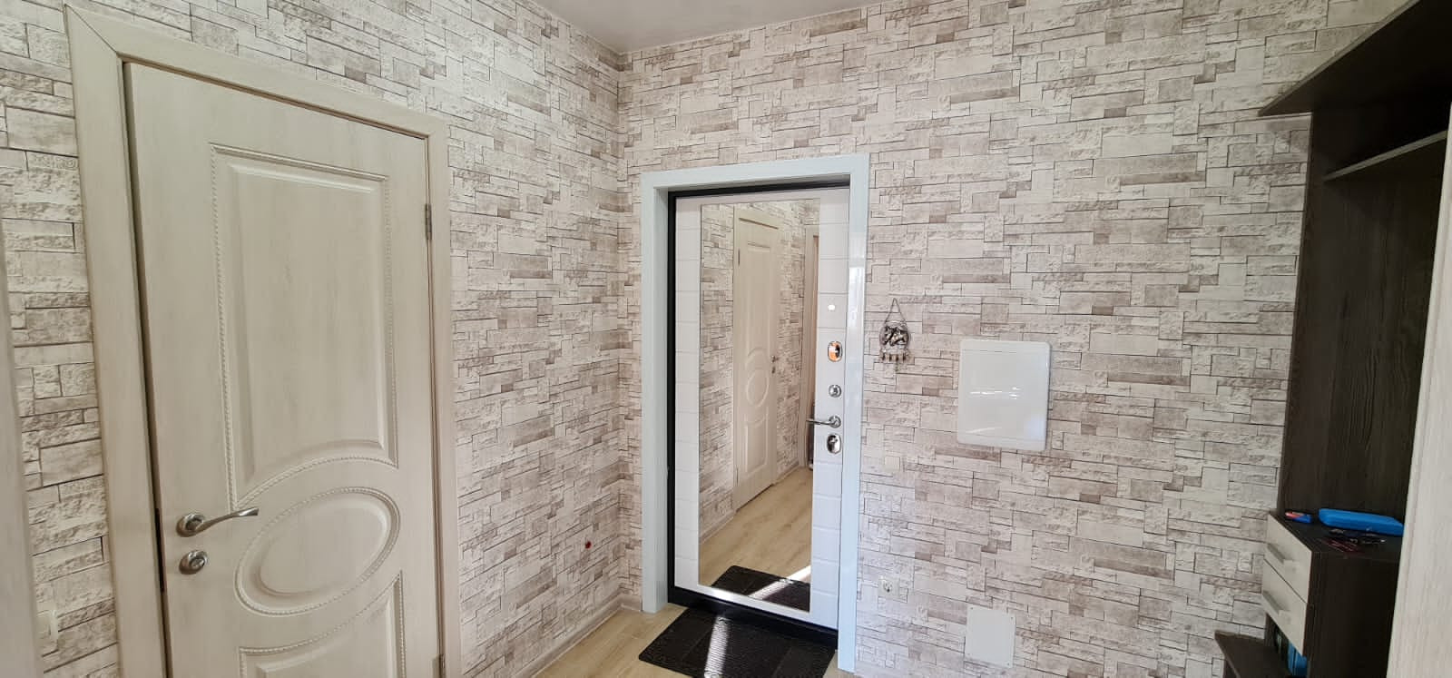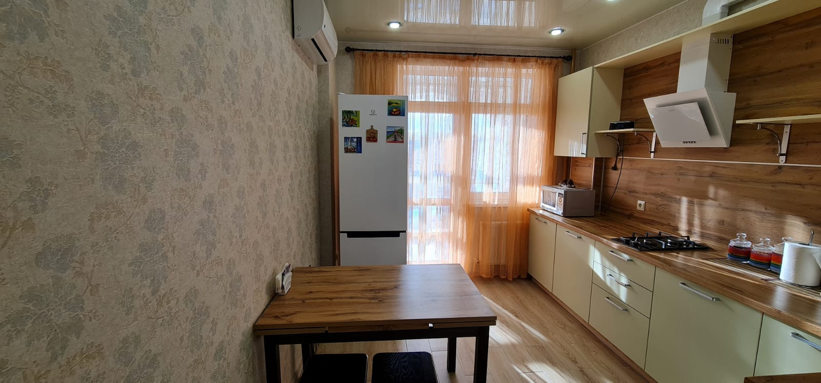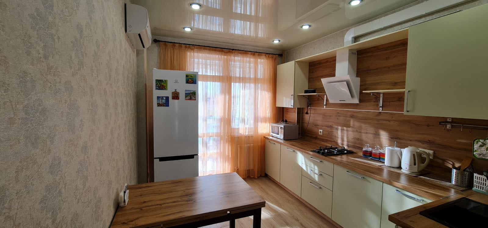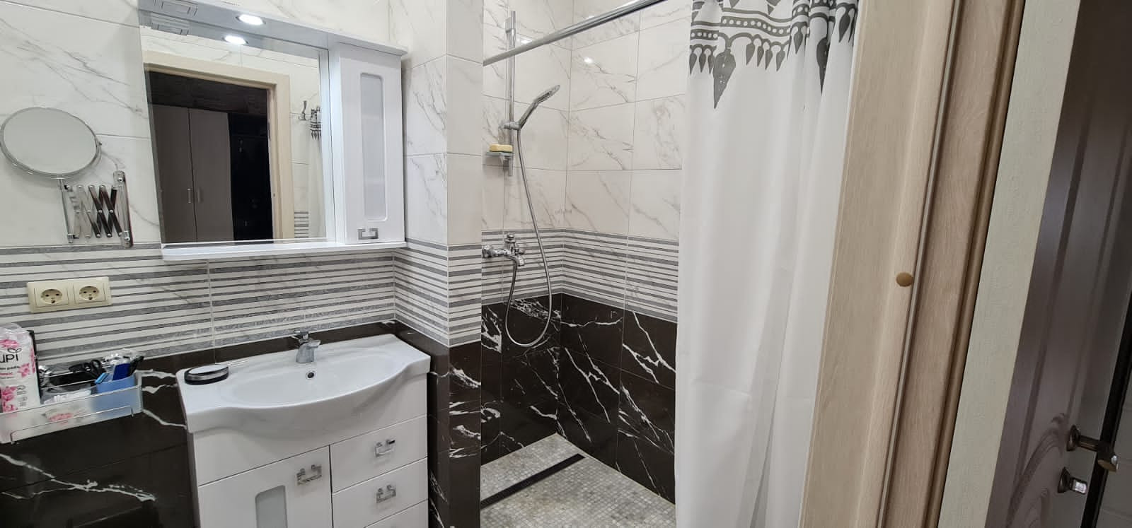 При отделке квартиры были использованы дорогие качественные материалы: натяжные потолки везде, плитка, ламинат на полах, обои производства Италия, Германия, Бельгия.