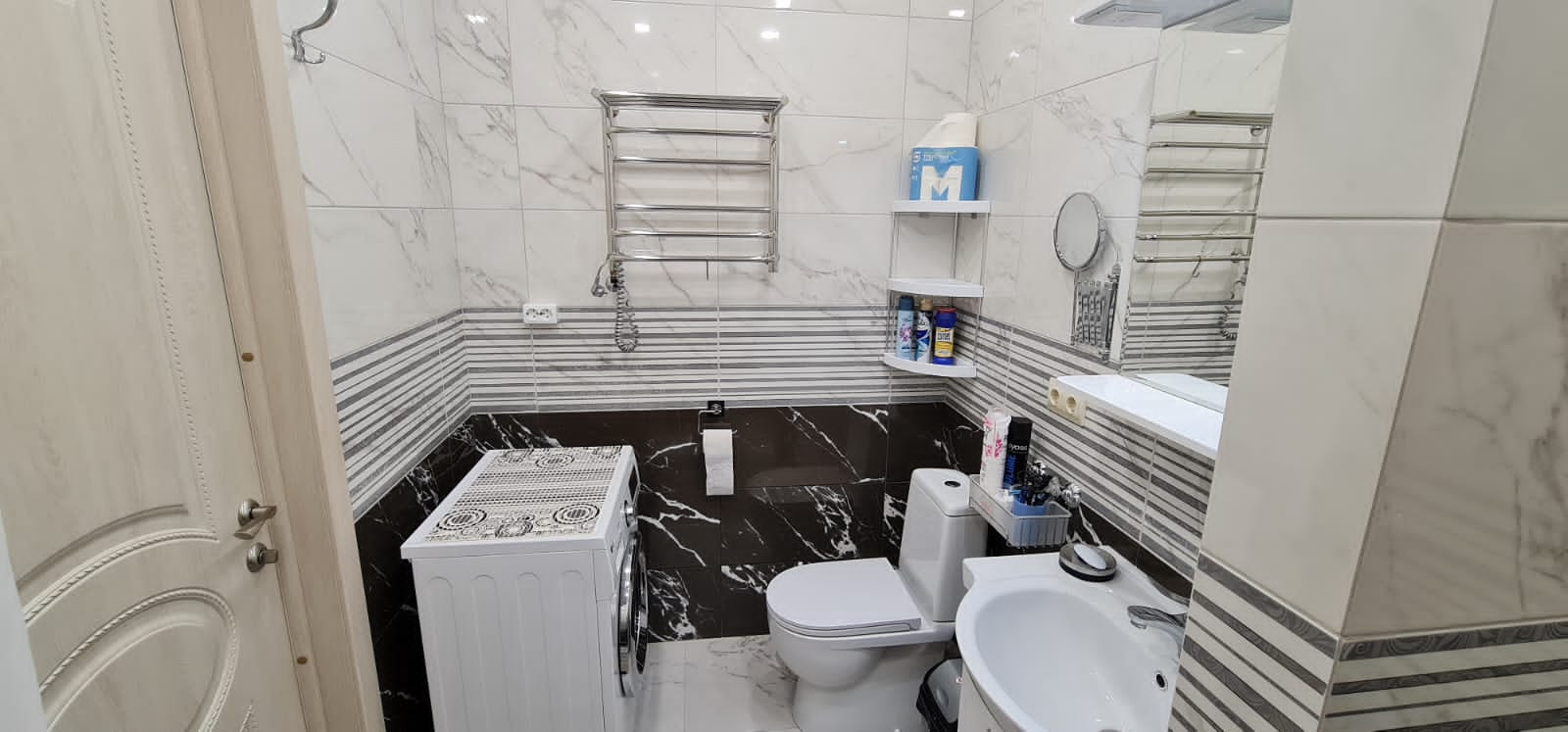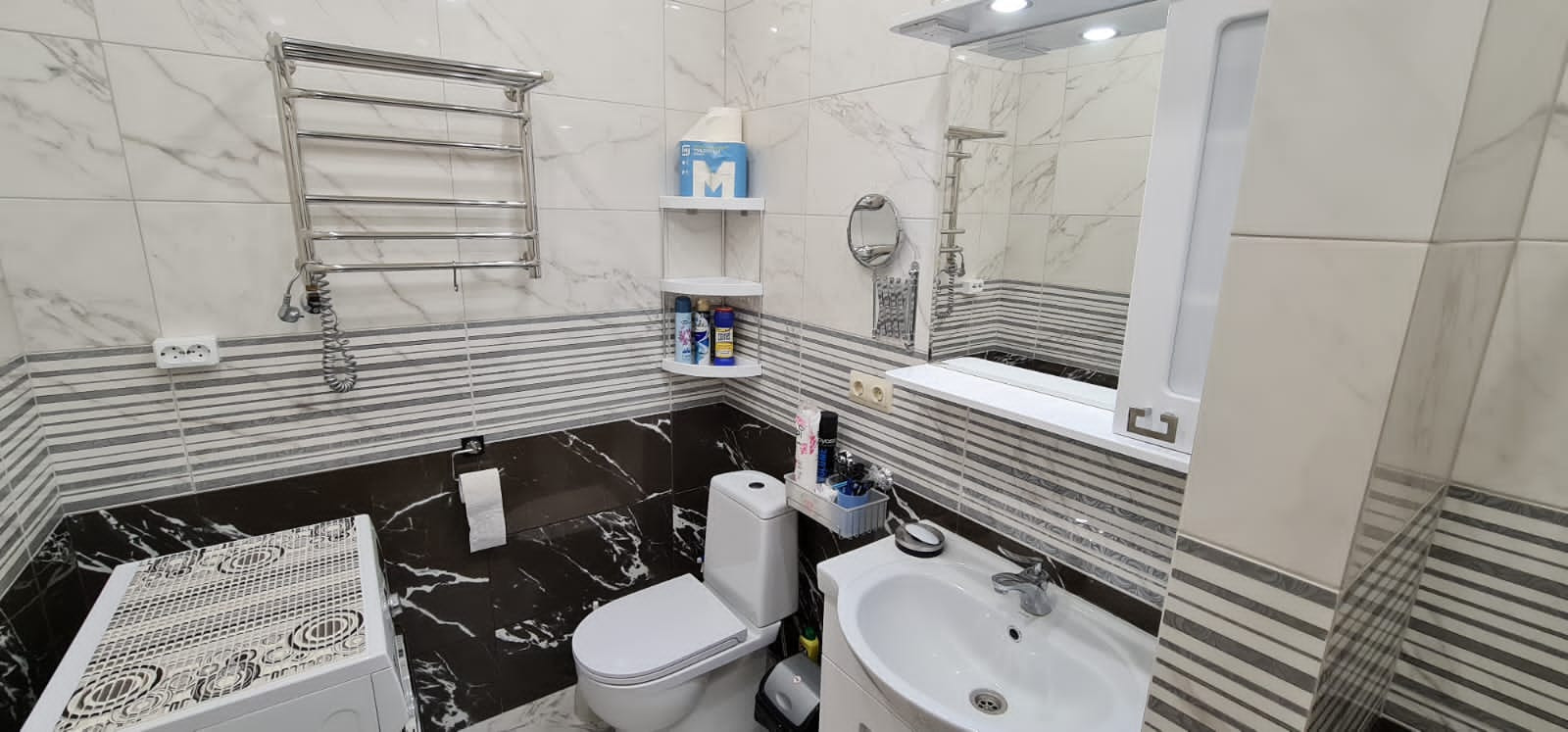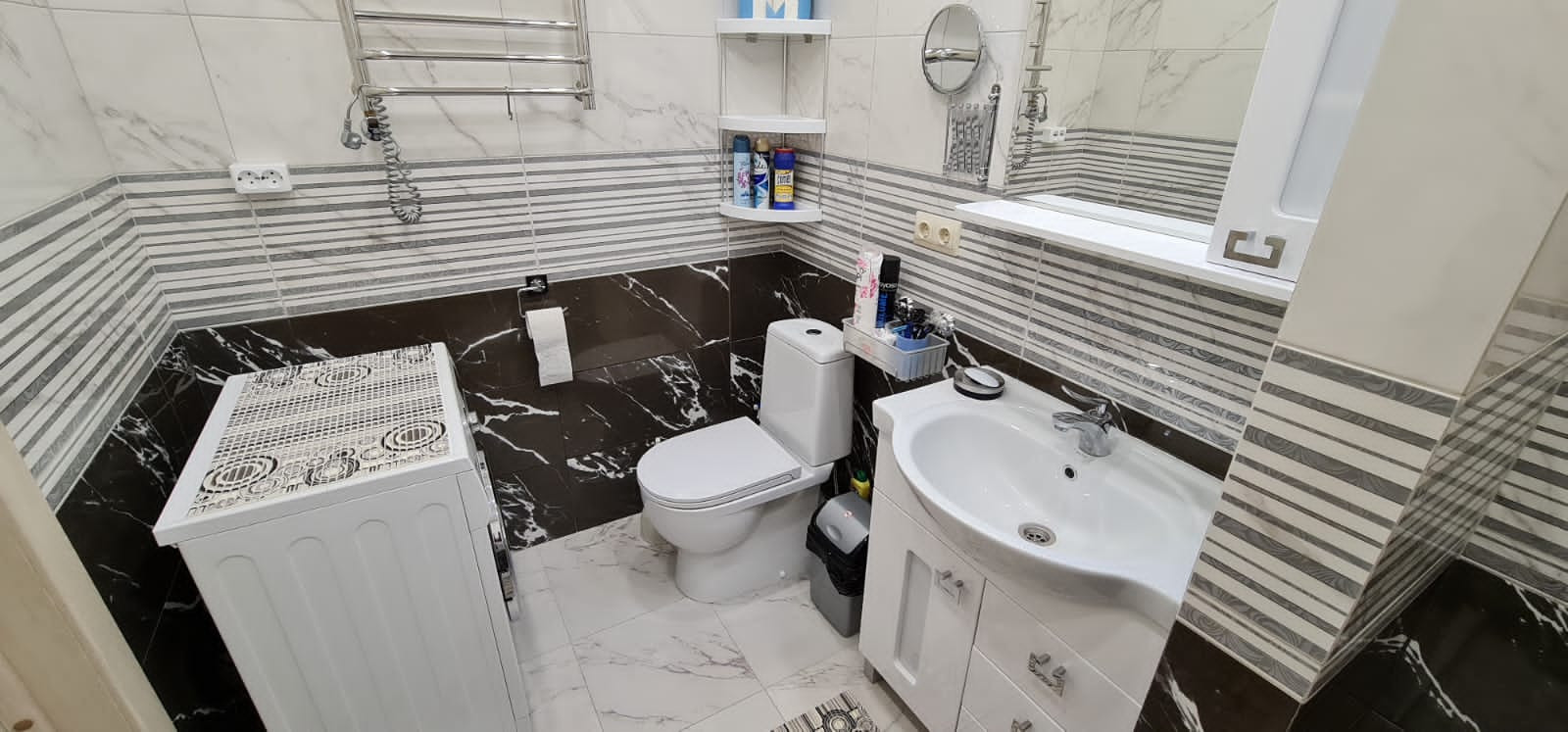В санузле (4,45 кв.м.) есть вся необходимая сантехника, а также стиральная машина, установлен электрический масляный полотенцесушитель.