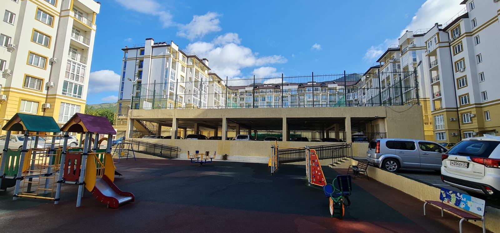На территории жилого комплекса много бесплатных крытых парковочных мест во дворе, а также есть платные машиноместа в паркинге.