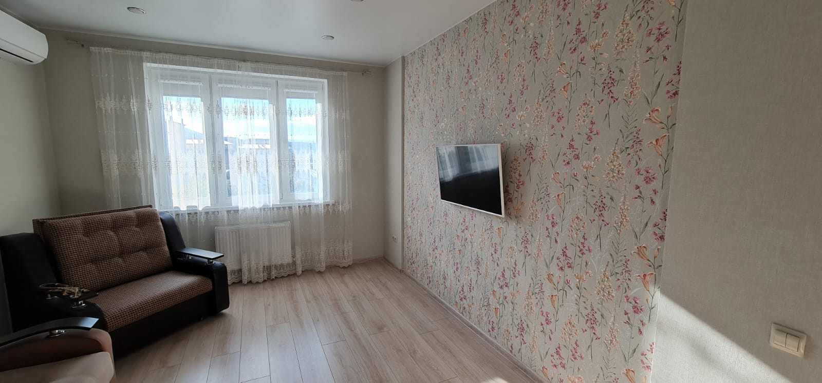 Окна квартиры выходят на восточную сторону. Из окон открывается шикарный вид на горы. В квартире есть интернет, телевидение, домофон.