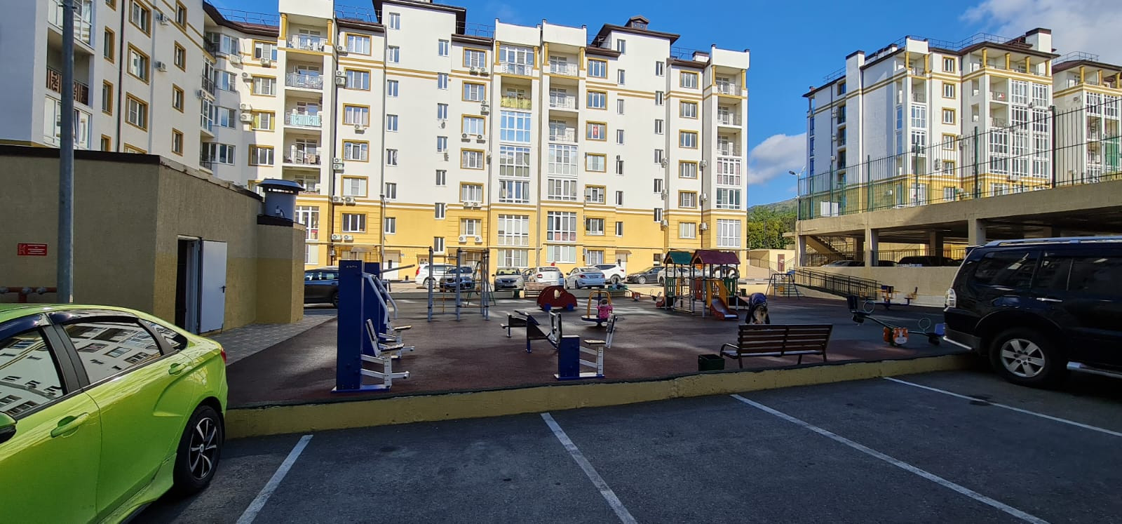 Территория жилого комплекса облагорожена. В тихом уютном дворе есть детская площадка, площадка с тренажерами, спортивные площадки.