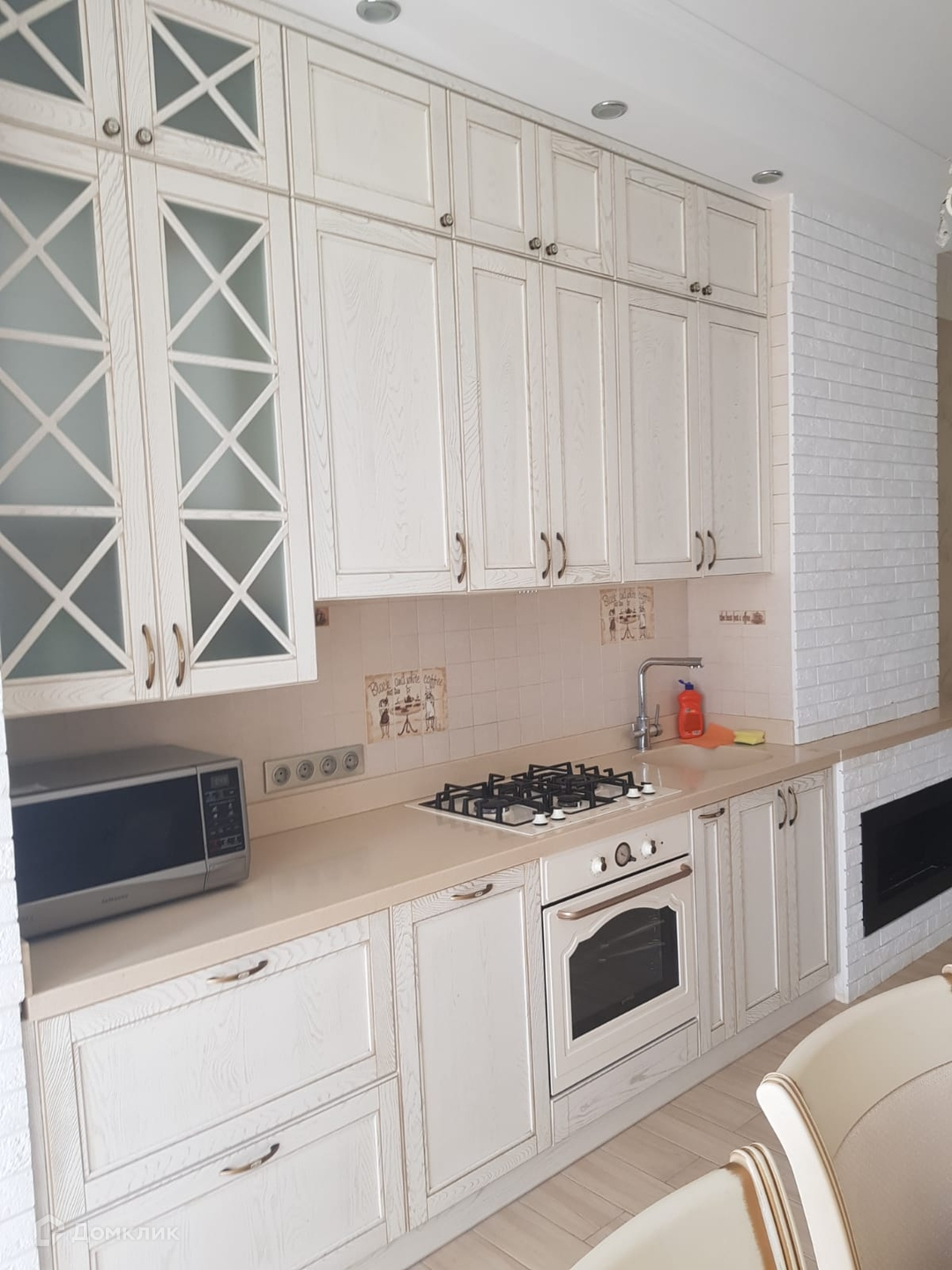 На кухне встроенный кухонный гарнитур из дорогих материалов, газовая плита. Прапвильная расстановка оборудования, разделение рабочей и обеденных зон.