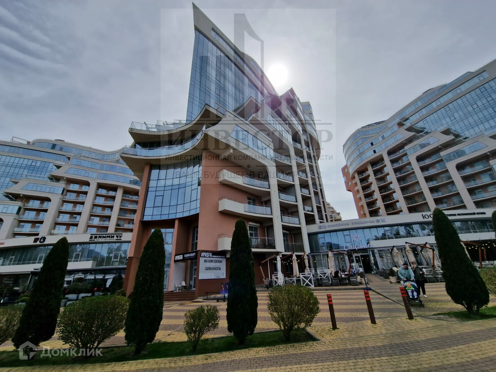 На территории комплекса расположен открытый бассейн, кафе, магазины, салоны красоты.