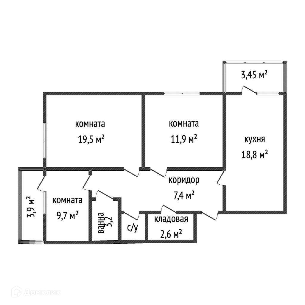 Три изолированные комнаты, два балкона, раздельный санузел и кладовка.