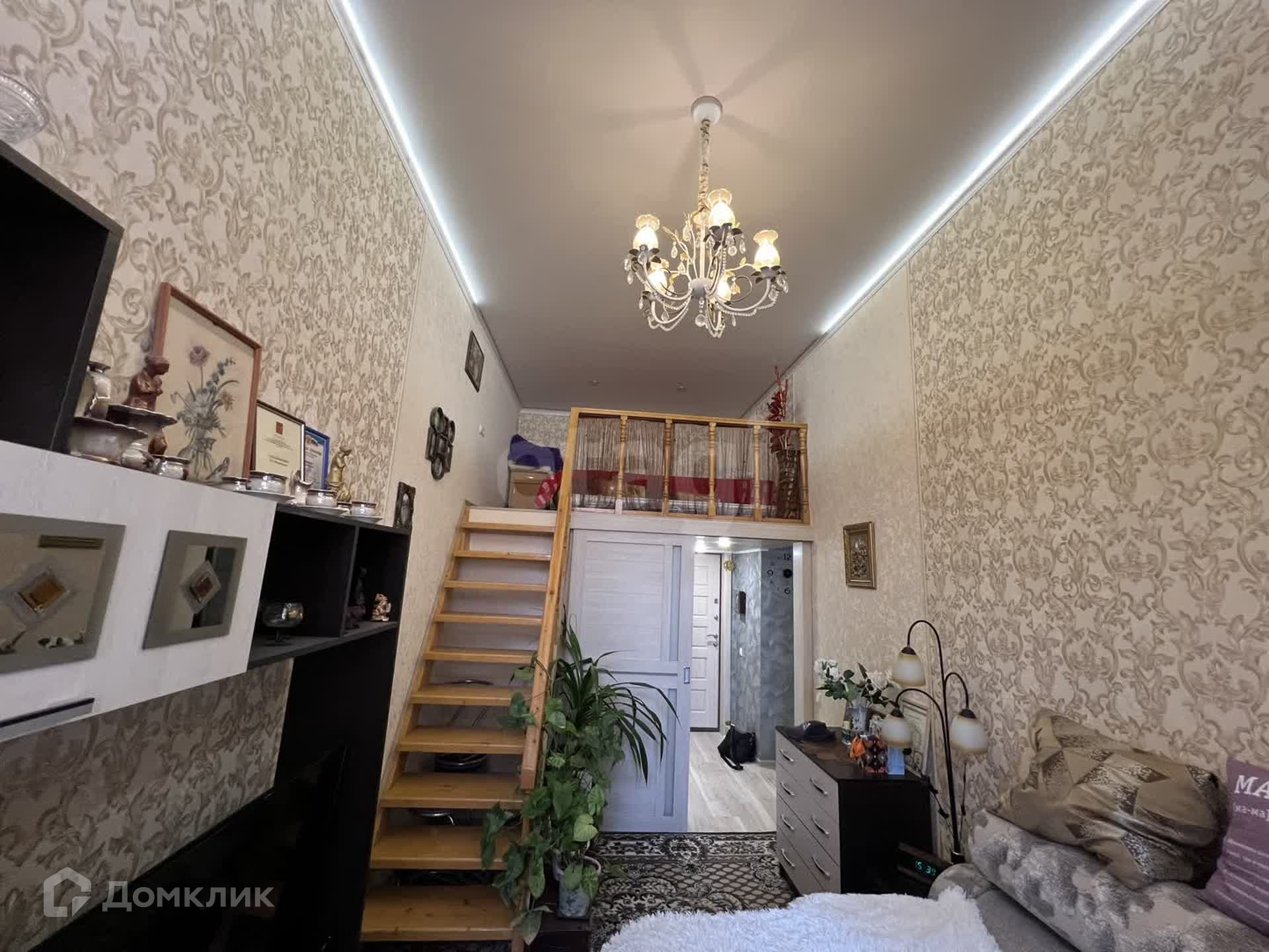 Жилая комната двухуровневая, благодаря чему увеличивается площадь квартиры на 6 м². Стены, мебель и шторы оформлены в светло-коричневых тонах, создавая атмосферу уюта и тепла. На втором ярусе расположена полноценная спальная зона, которая понравится детям. Лестница выполнена из дерева и прочная. Пространство второго яруса обрамлено деревянными балясинами, создавая эффект театрального балкончика.