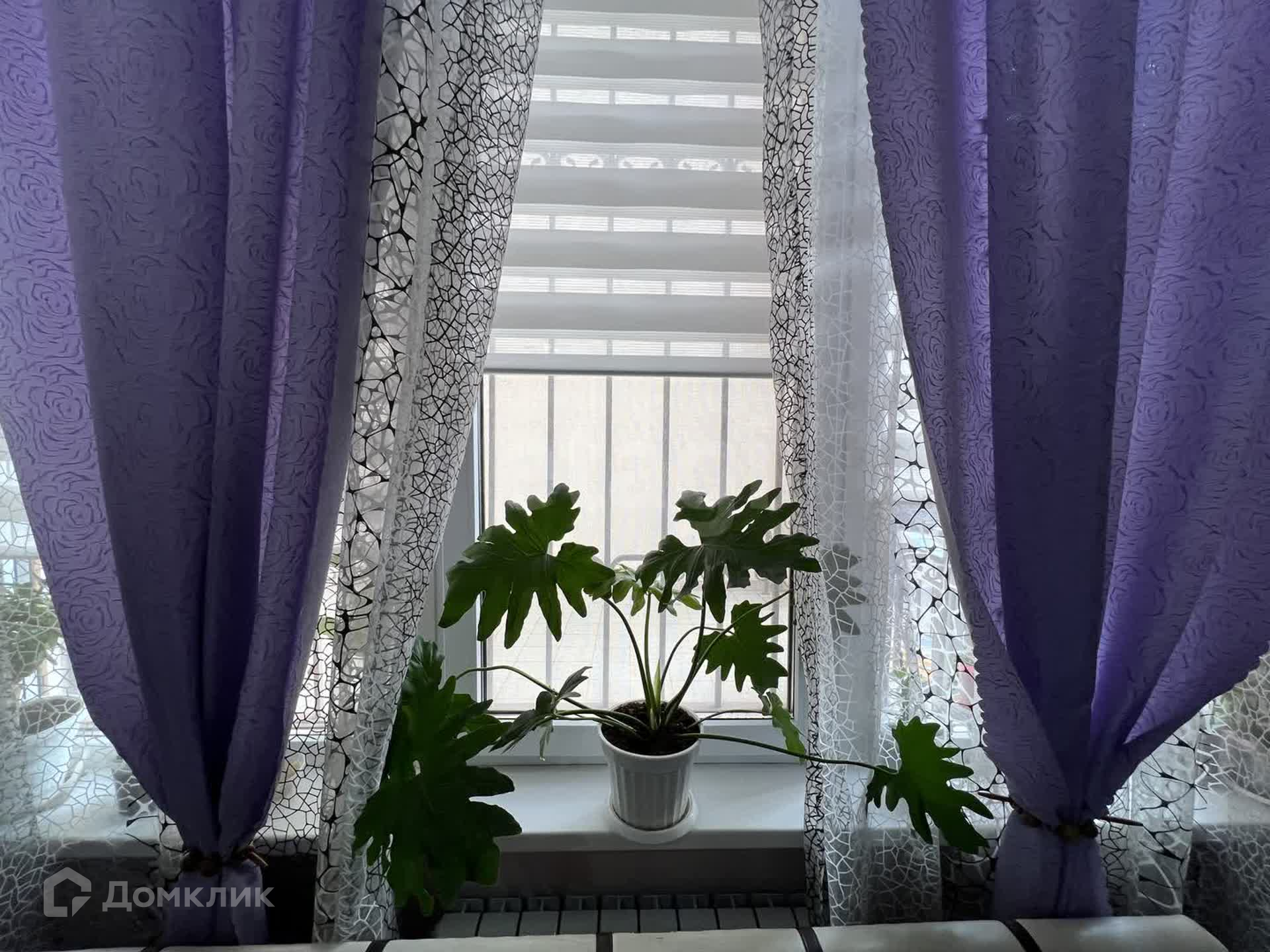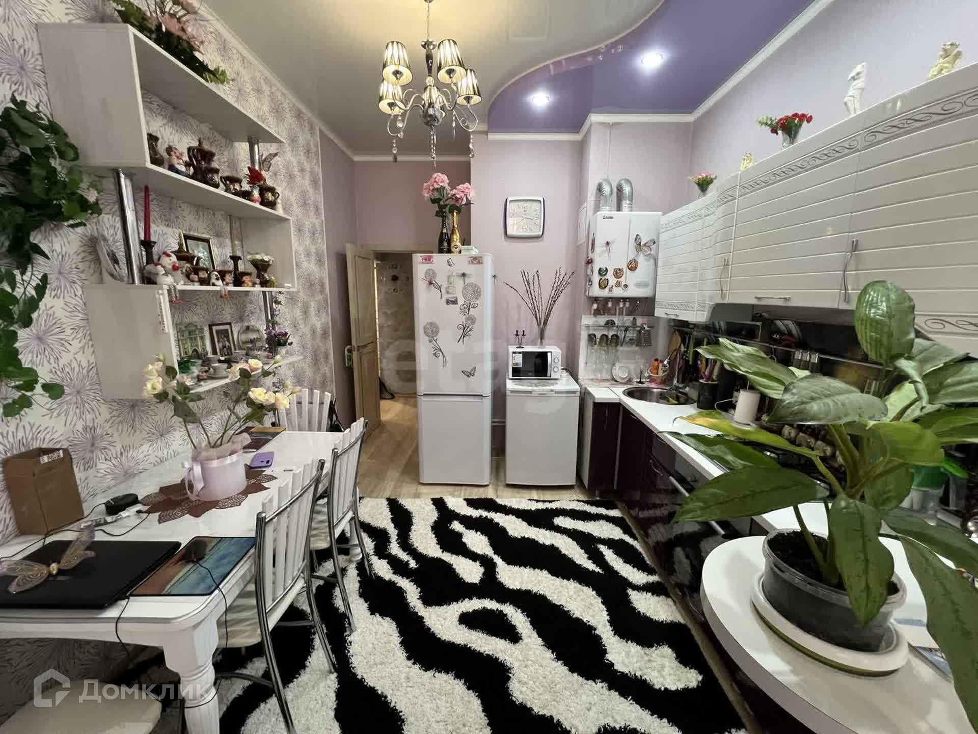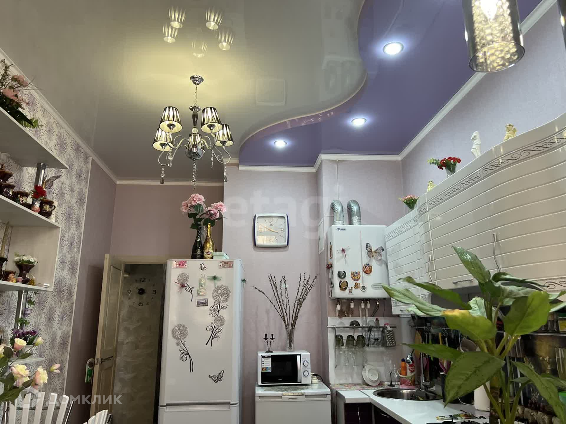 Уютная кухня площадью 15,9 м² выполнена в стильном дизайне с использованием нежно-фиолетового цвета, расслабляющей лаванды и светло-бежевого. Кухонный гарнитур выполнен на заказ, из дорогих и качественных материалов. Для приготовления пищи есть газовая плита RainFord и духовой шкаф Simfer, а также большой холодильник Indesit.
