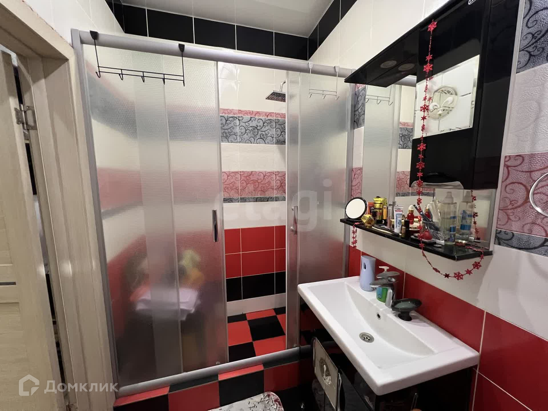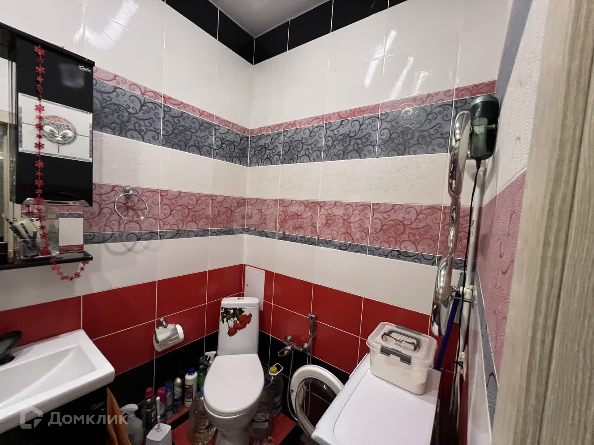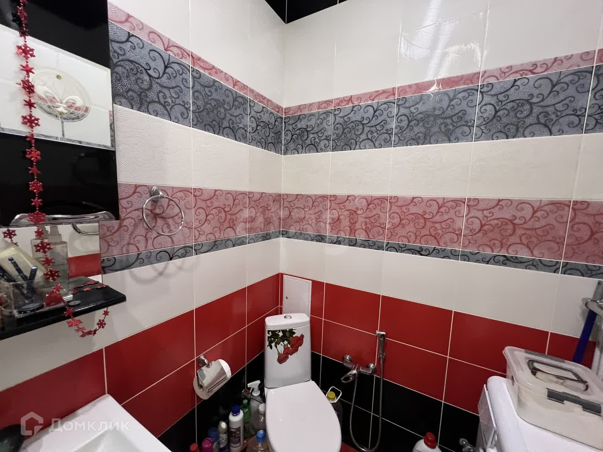 Санузел 4,6 м² совмещен, облицован красно-белой плиткой с небольшими вставками черного цвета.