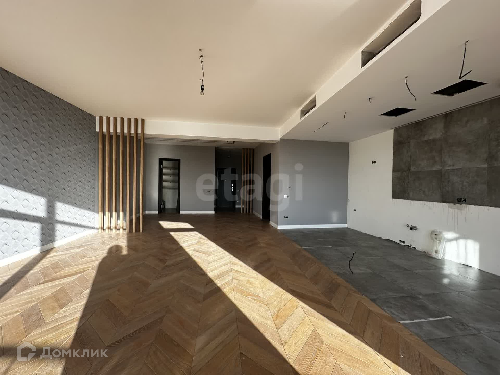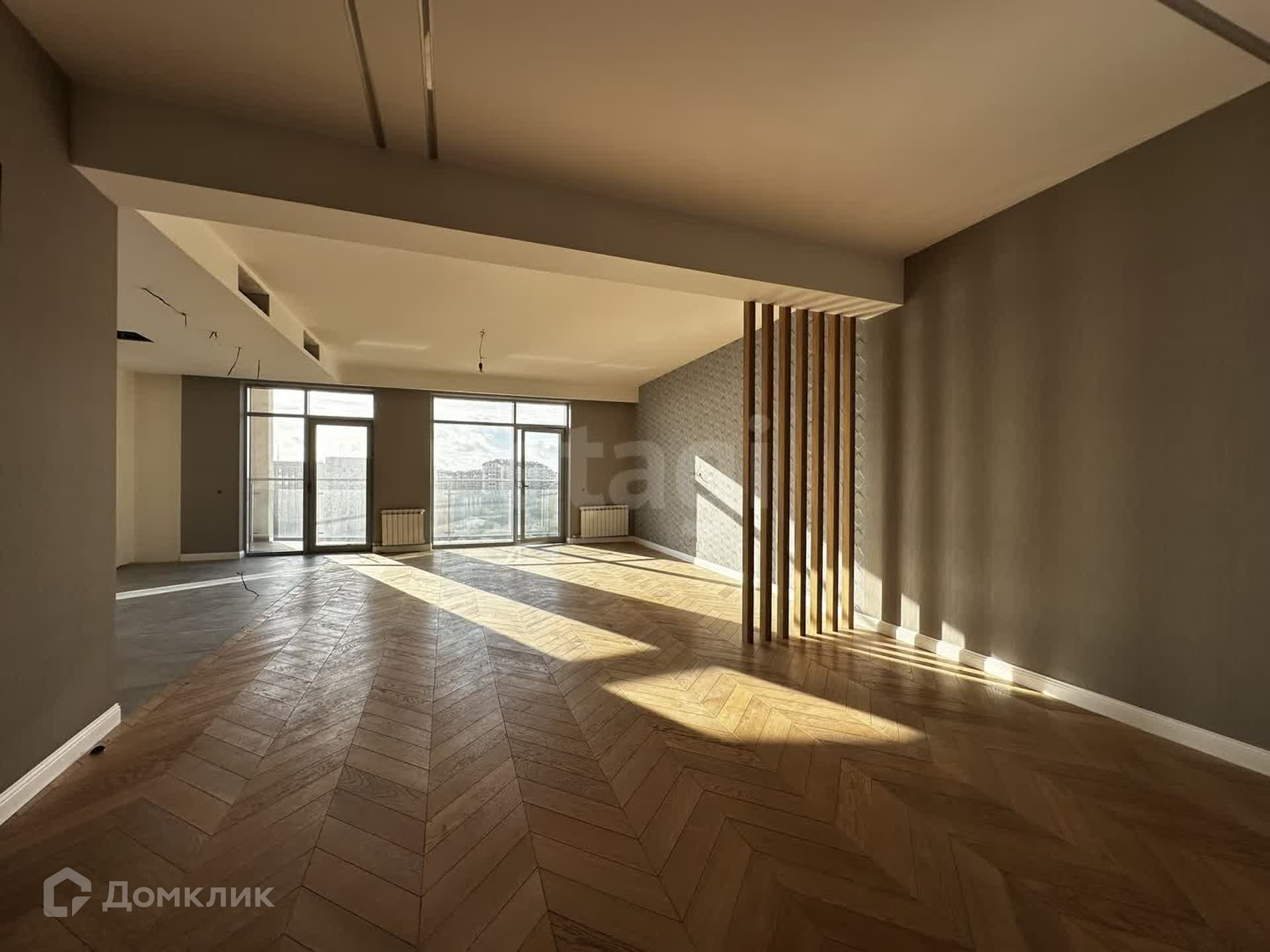 Представляет собой соединение двух квартир. Благодаря этому имеет четыре изолированных комнаты, две террассы, два санузла и два подсобных помещения, из которых вы можете оборудовать гардеробную или кладовую комнату. Ремонт на стадии завершения. Выполнен в современном стиле, в нейтральных тонах. Установлены качественные панорамные окна.