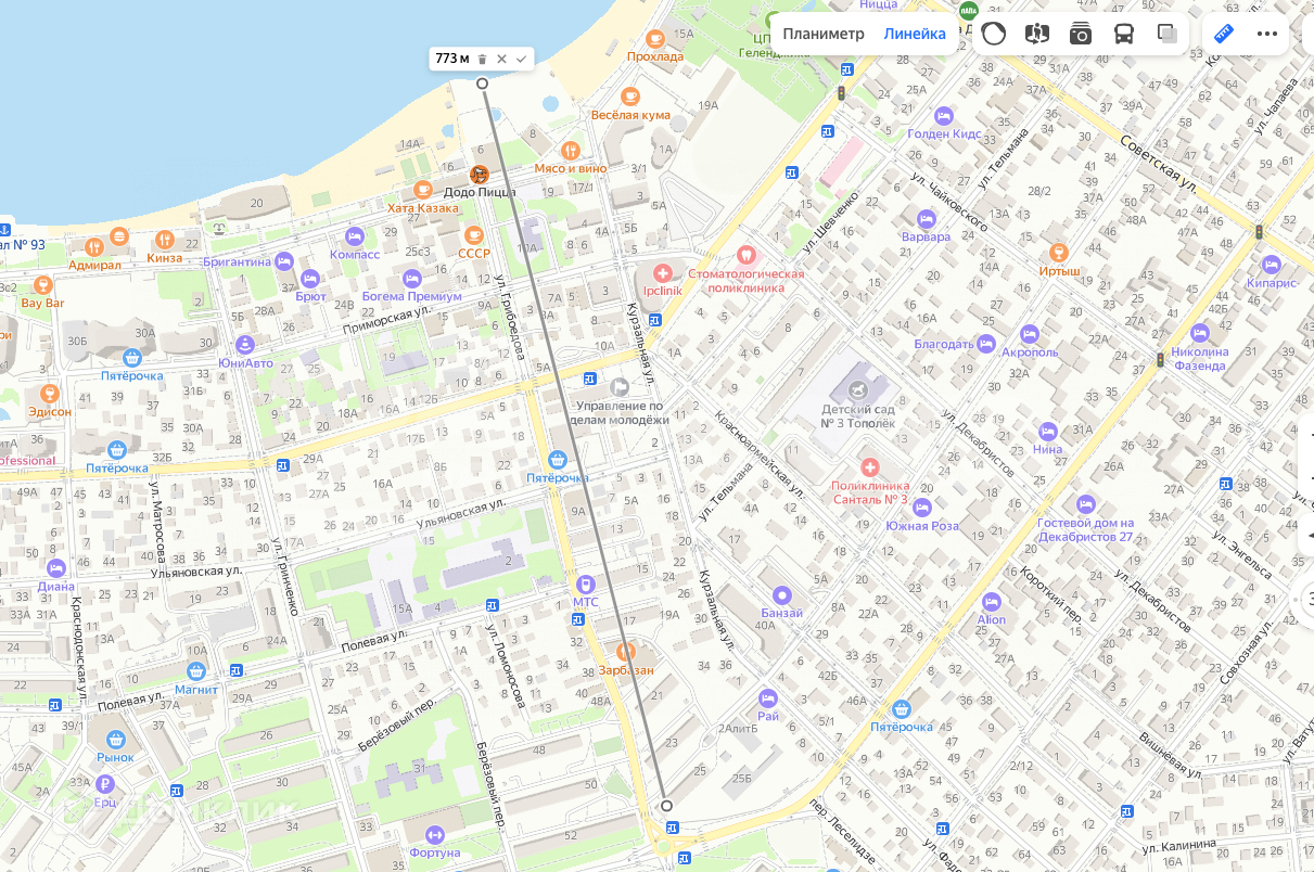До береговой линии 773м!, о.77км!!..... да что уж тут считать в метрах?