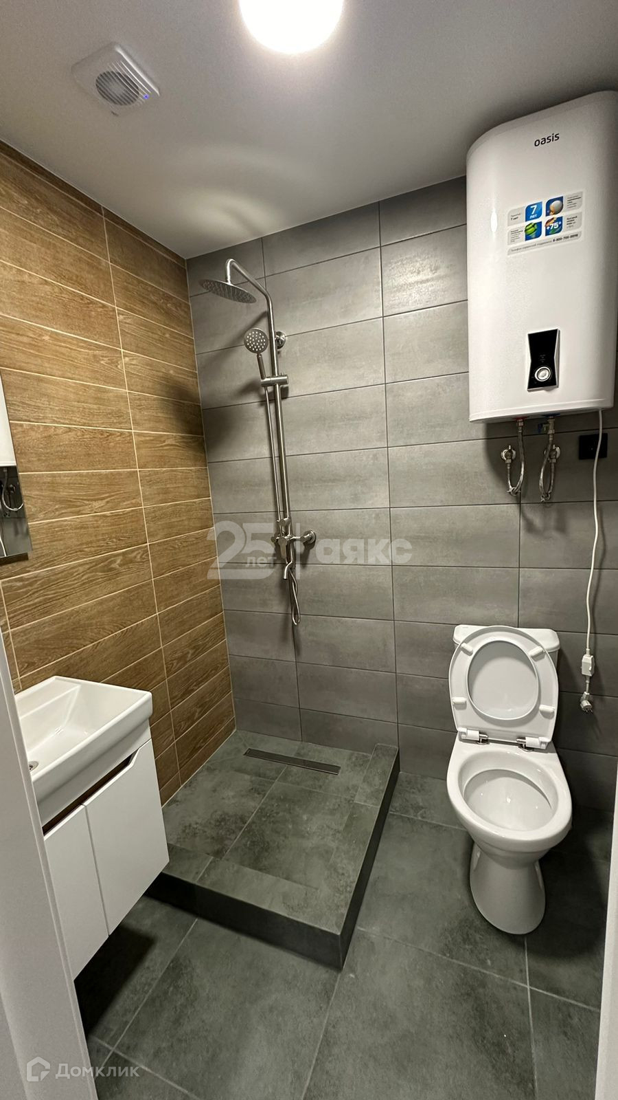 4. Санузел: тумба с раковиной, смесители, зеркало с подсветкой, душевой поддон из керамогранита, бойлер для горячей воды, унитаз.