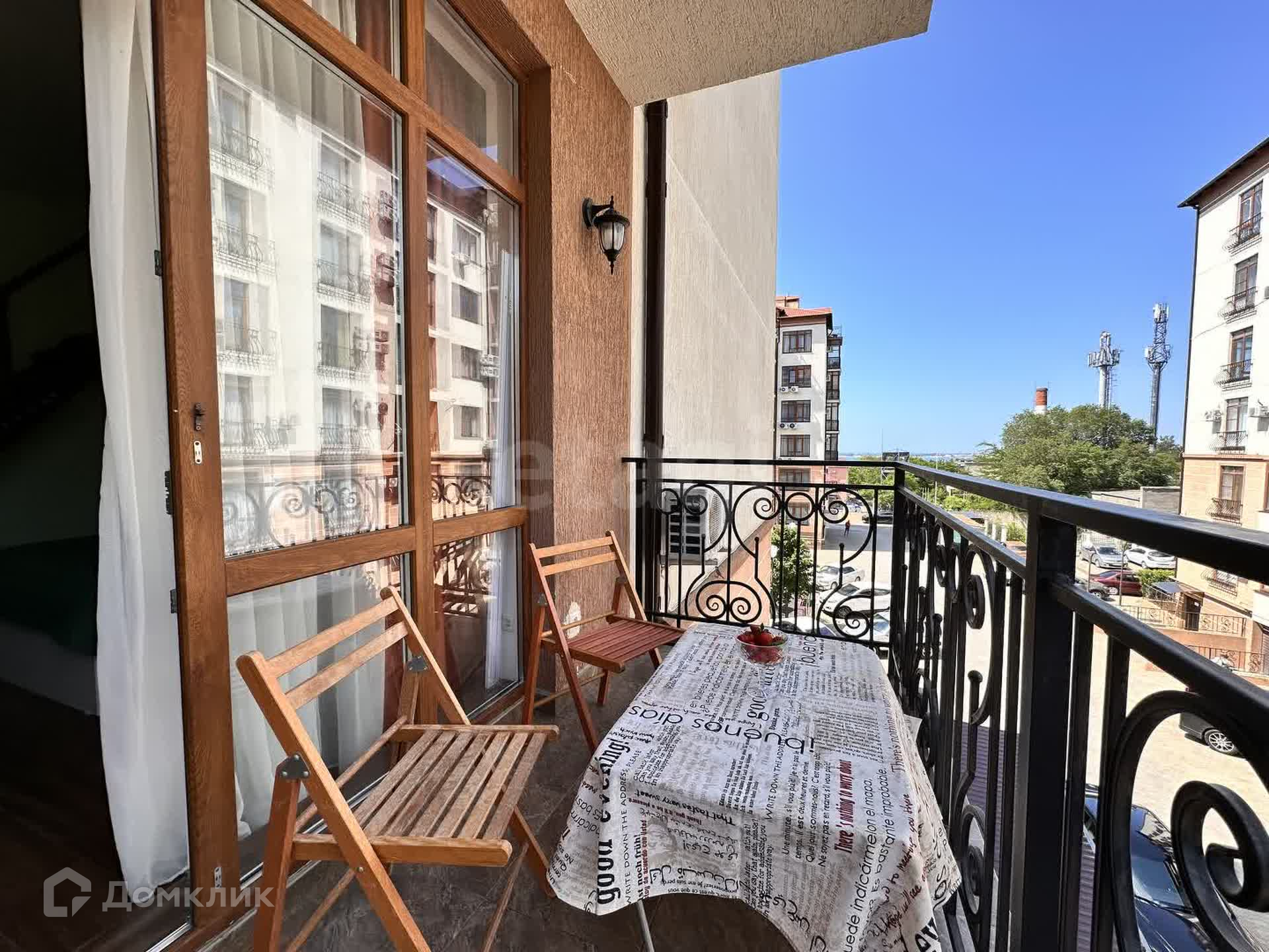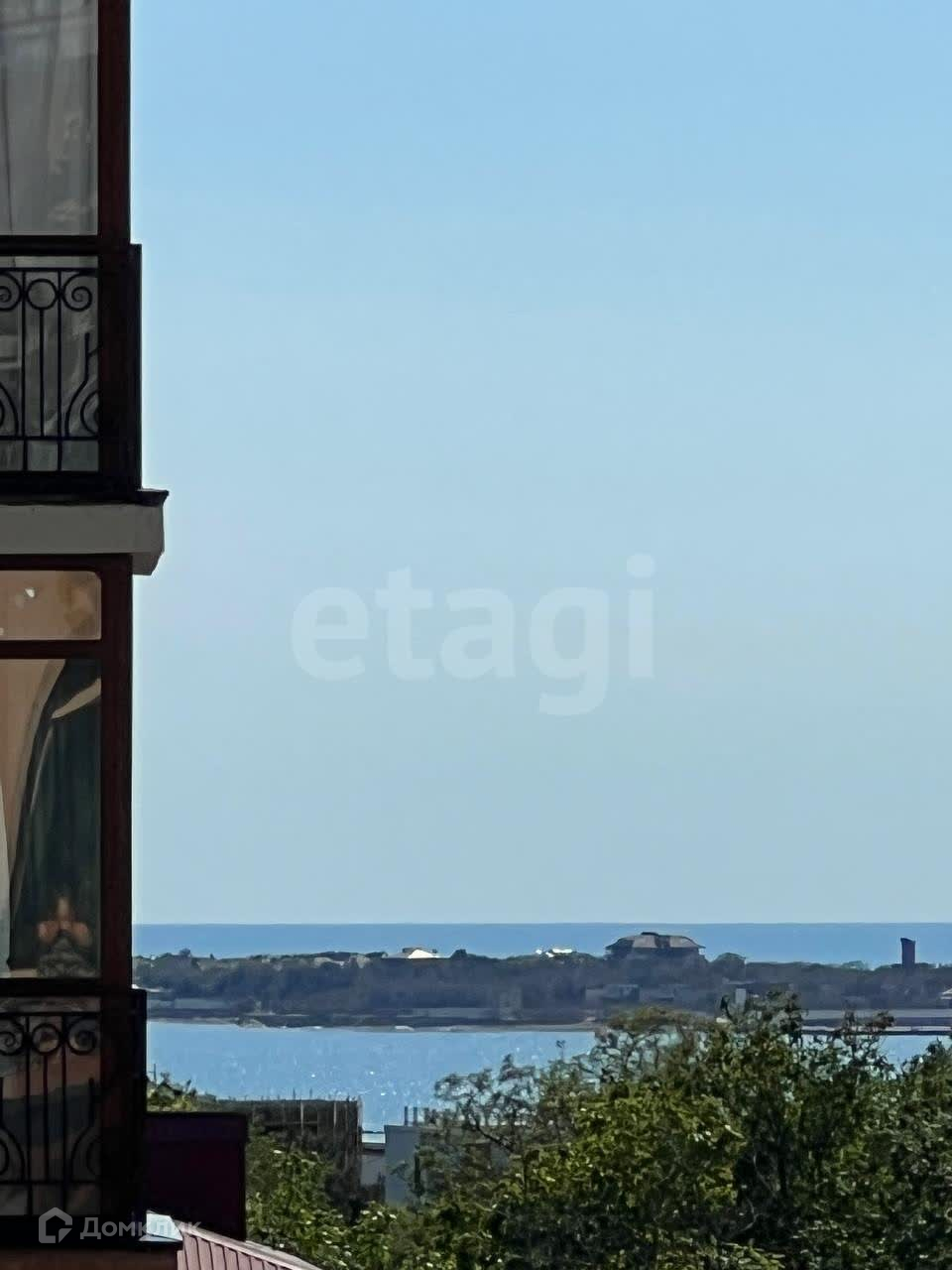 Большой открытый балкон, с которого открывается вид на море и горы.