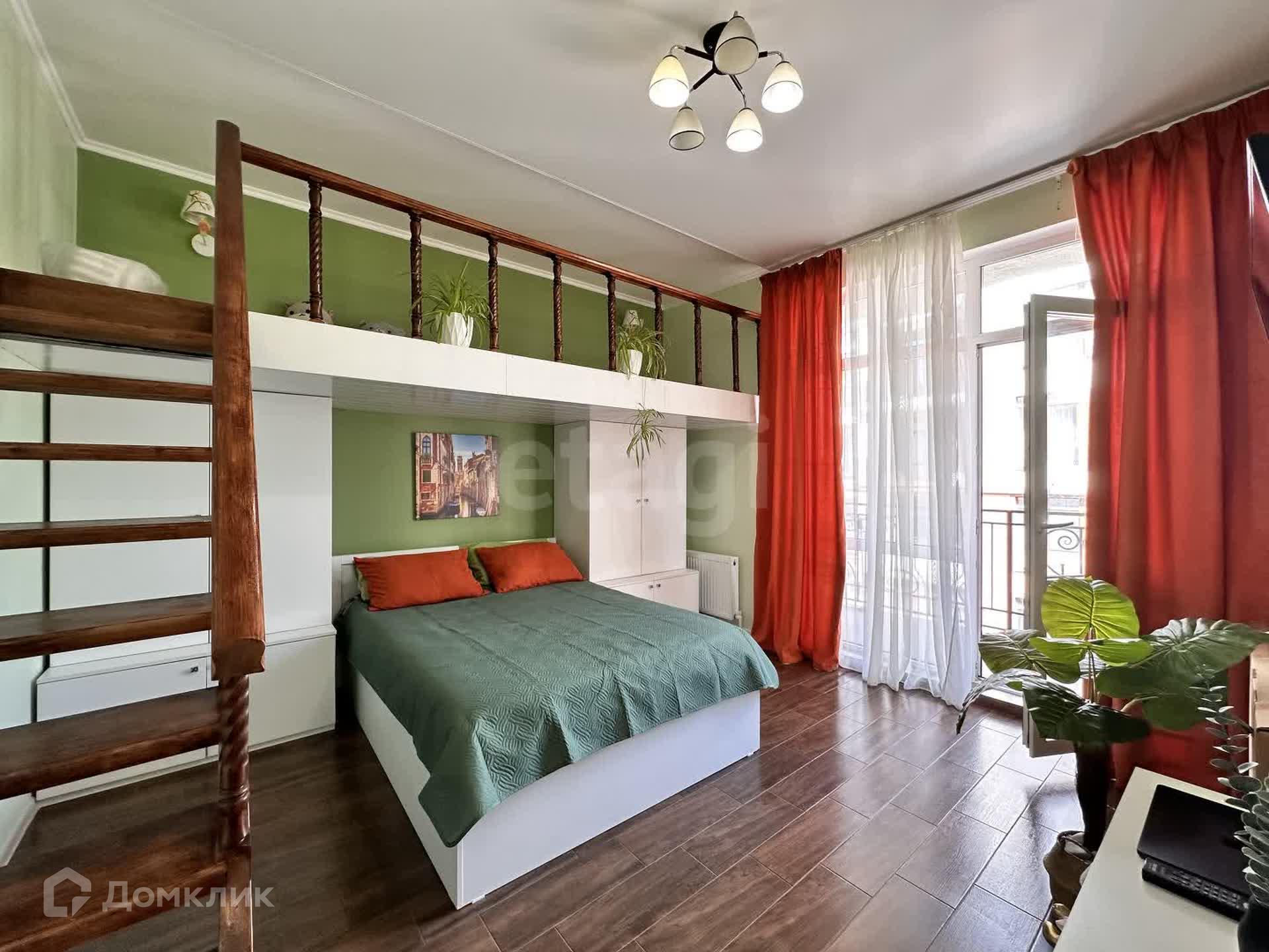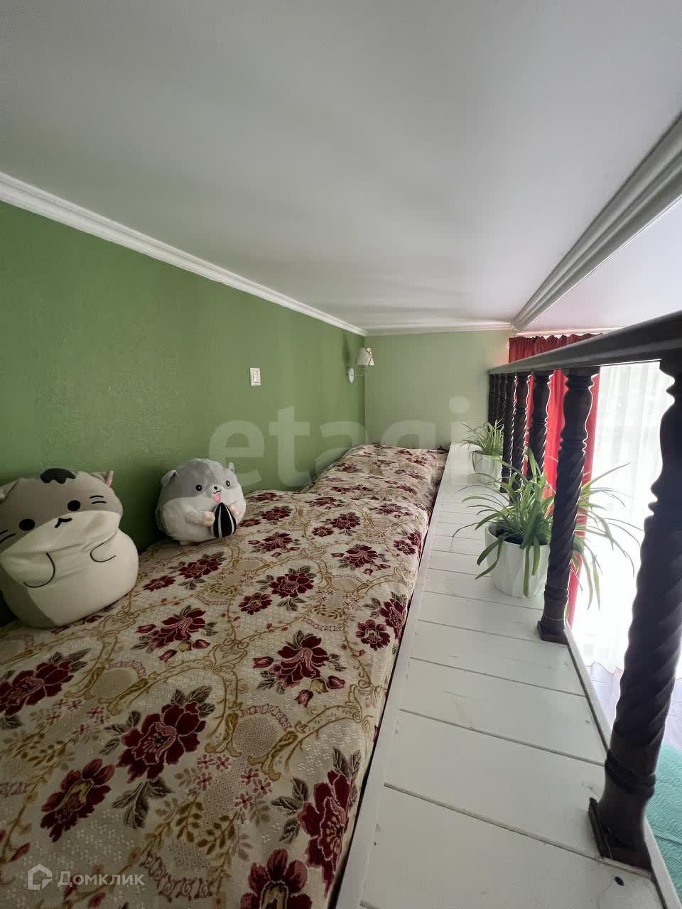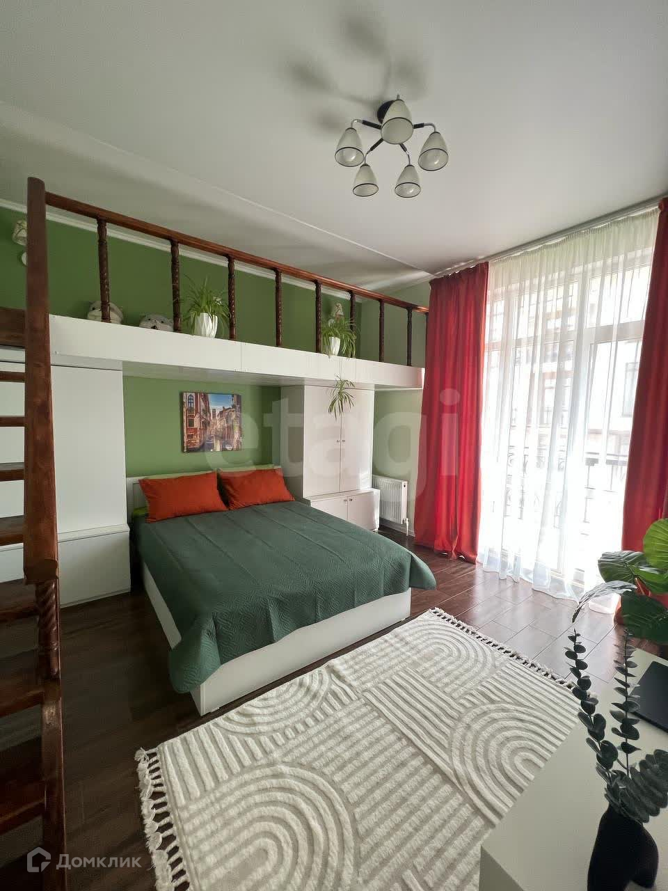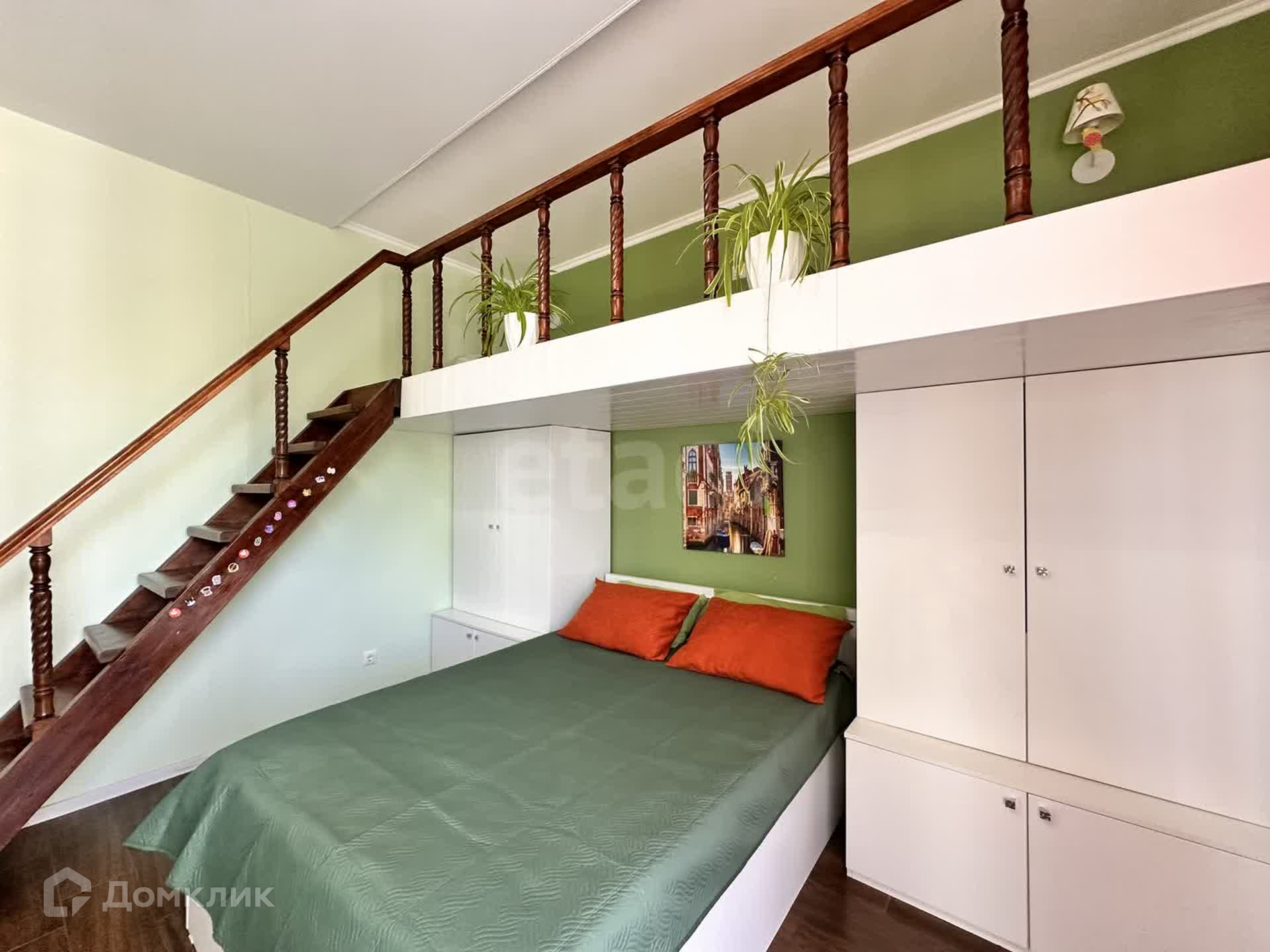 В спальне 4 спальных места, двуспальная кровать и два места на втором антресольном уровне.