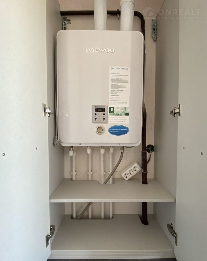 Автономное отопление, двухконтурный газовый котел установлен. Теплые полы в санузле подведены, выводы под кондиционеры сделаны в кухне и комнате, но сами кондиционеры не установлены.