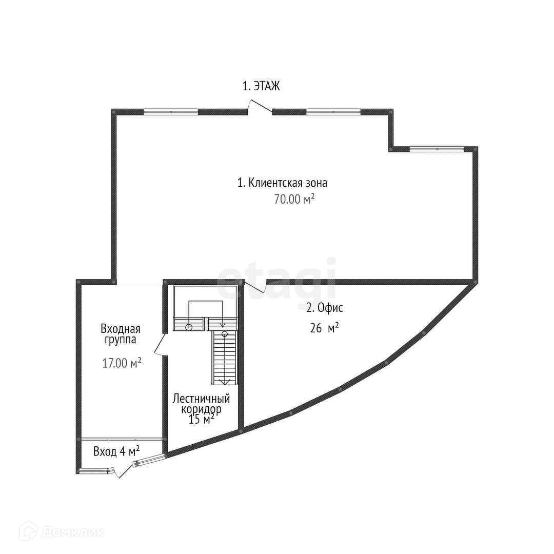 1 этаж: входная группа 4 м2, приемная 17 м2, клиентская зона 70 м2, кабинет 29 м2, лестничный марш 15 м2;