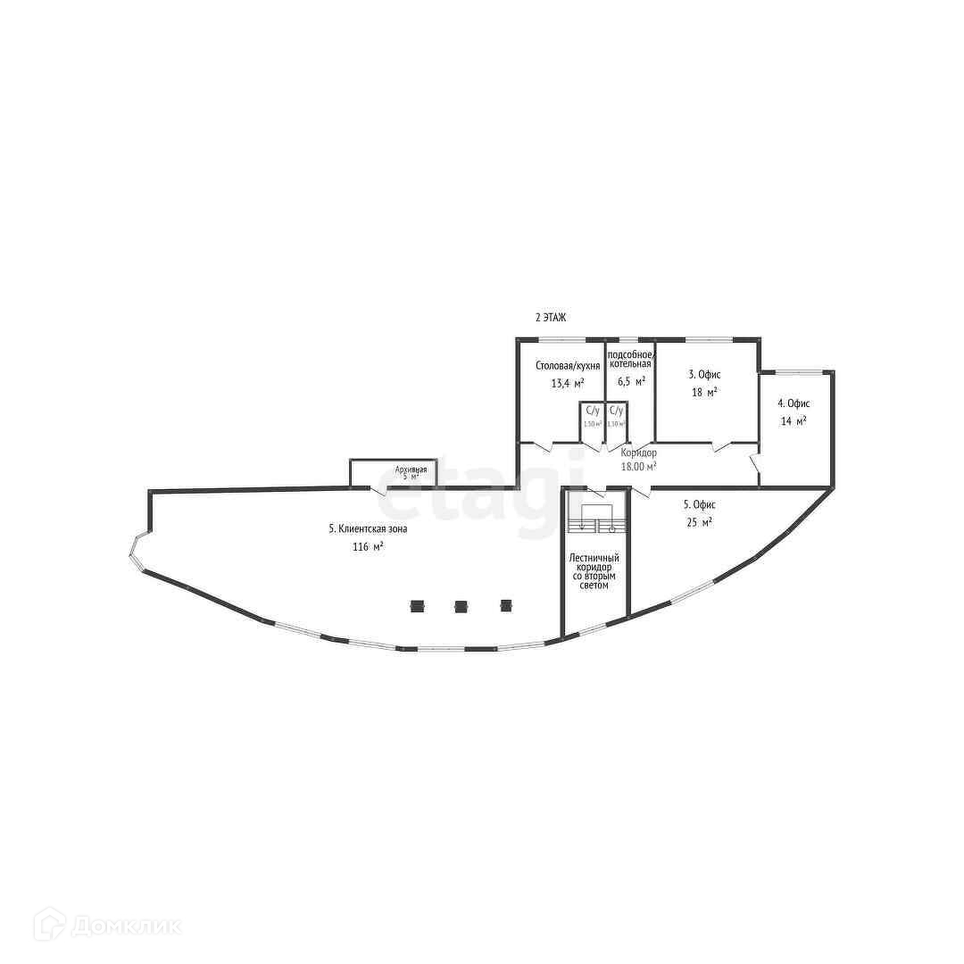 2 этаж: клиентская зона 116 м2, три кабинета площадью 14 м2, 18 м2 и 25 м2, комната для персонала с оборудованной кухней 13 м2, два с/у, техническое помещение 6 м2, архивное помещение 5 м2, коридор 18 м2.