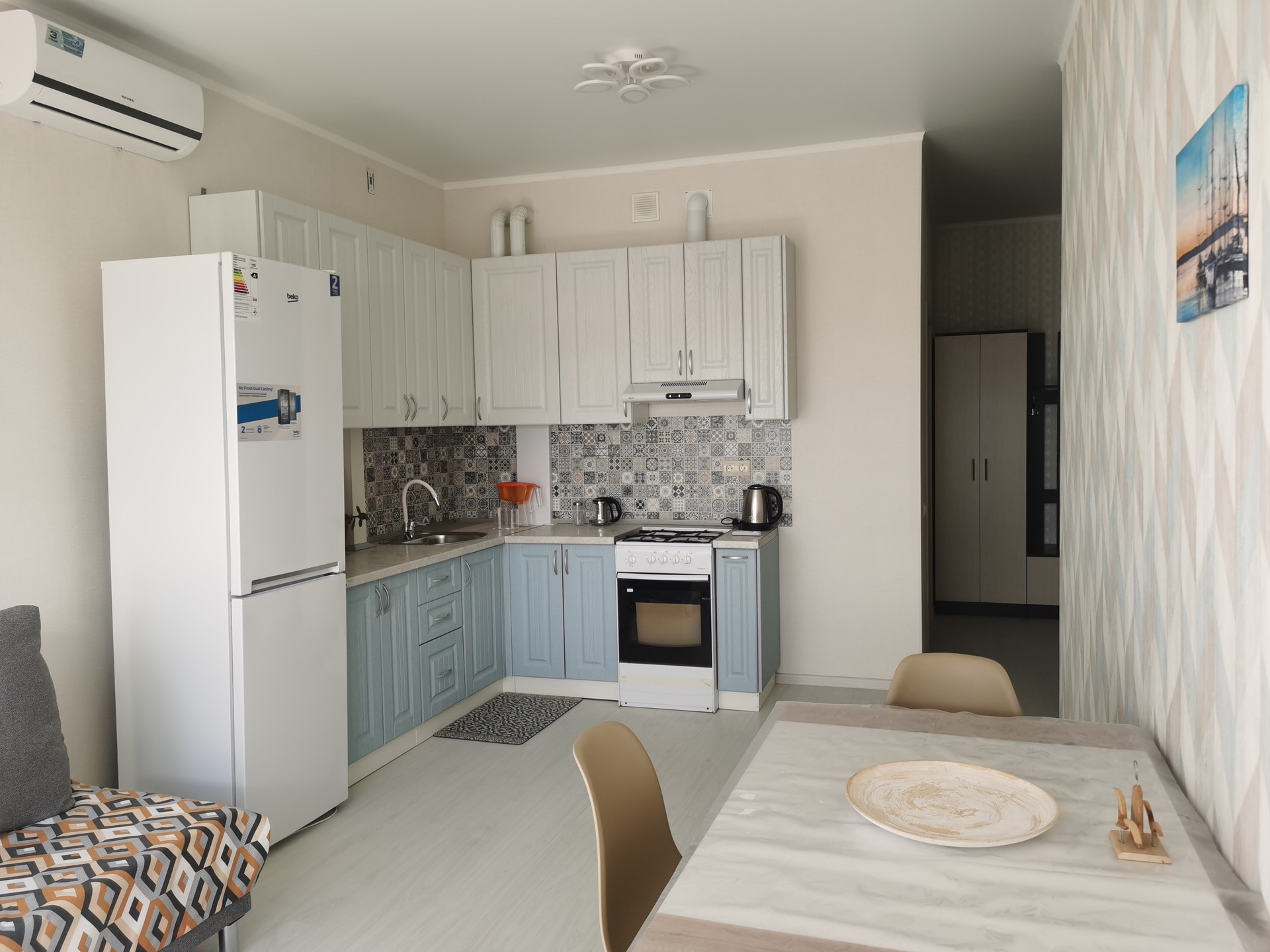 Три отдельных комнаты, кухня гостина со спальным местом и большим телевизором.