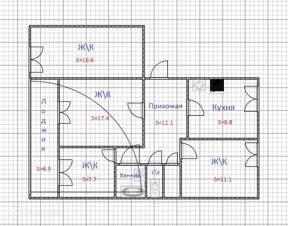 Площадь квартиры - 79 кв. м. Комнаты изолированные\\смежные: 16.6 ;17.4;7.7;11.1 кв. м. площадью.